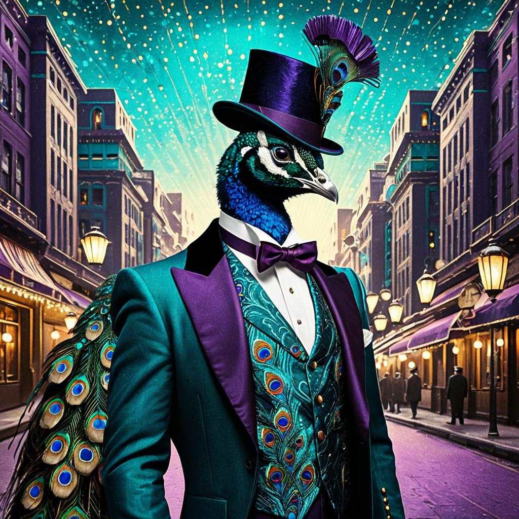 Digital illustration of a Elegant Peacock wearing a plumed142edghat hat and tailcoat adorned with feathers suit in vibrant teals, purples, and golds, stylized cityscape background with art deco buildings and glowing lanterns, highly detailed with intricate patterns on suit and mix of smooth and textured surfaces