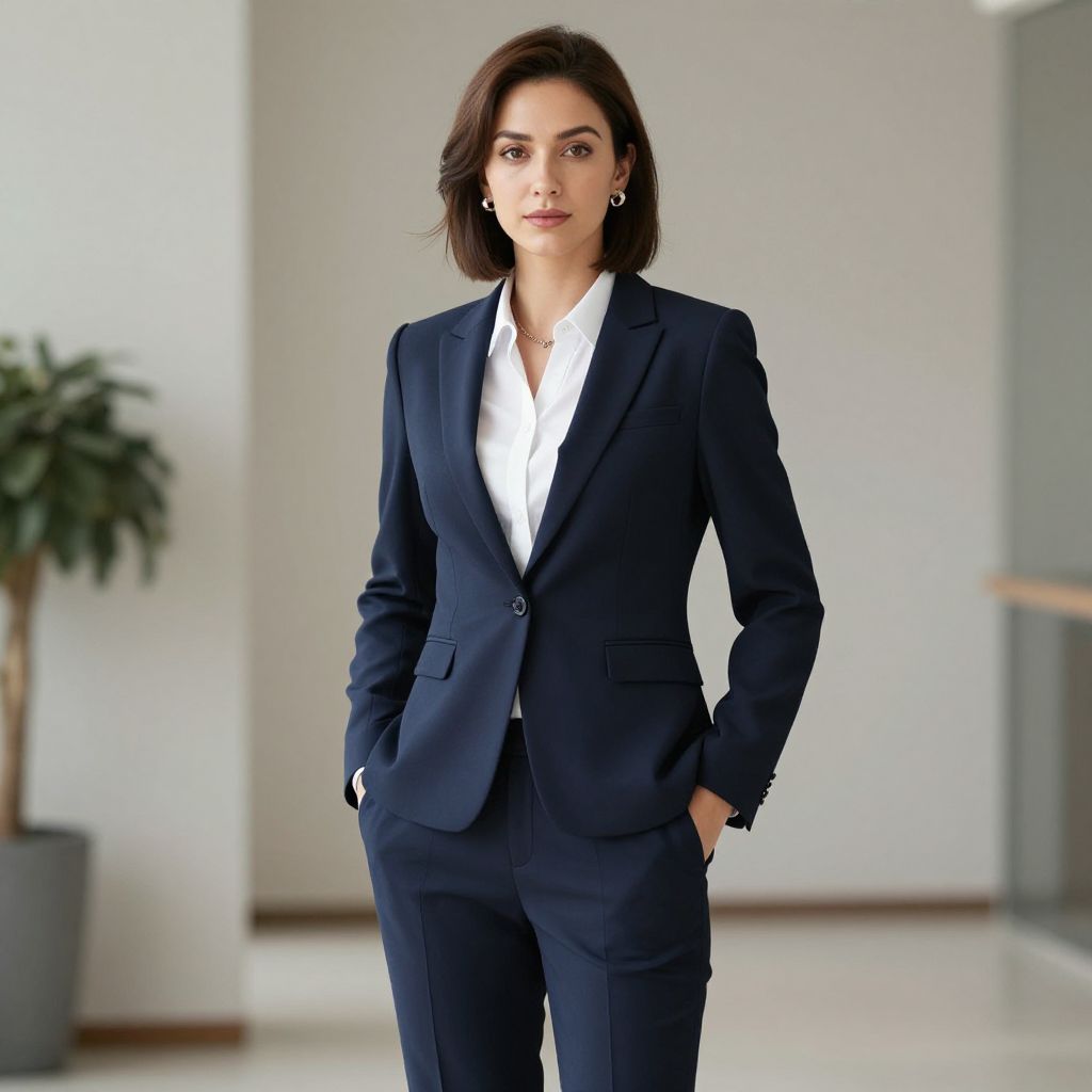 Photograph of a confident woman standing in a modern, minimalistic office space. She has light olive skin, dark brown shoulder-length hair, and is wearing a tailored, dark navy blue suit with a white dress shirt. Her hands are in her pockets, and she has small, simple earrings. The background features a blurred green potted plant on the left and a white wall with a wooden railing on the right. The lighting is bright and natural, highlighting her professional appearance. The overall style is clean and contemporary.