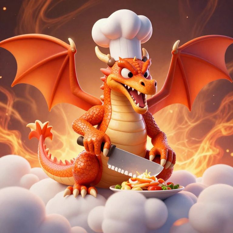 A vibrant 3D-rendered fantasy illustration depicts a majestic orange dragon adorned with a chef's hat, gracefully slicing through fluffy white clouds with its sharp teeth, as if preparing a celestial dish over a fiery backdrop of swirling winds and dramatic lighting effects.