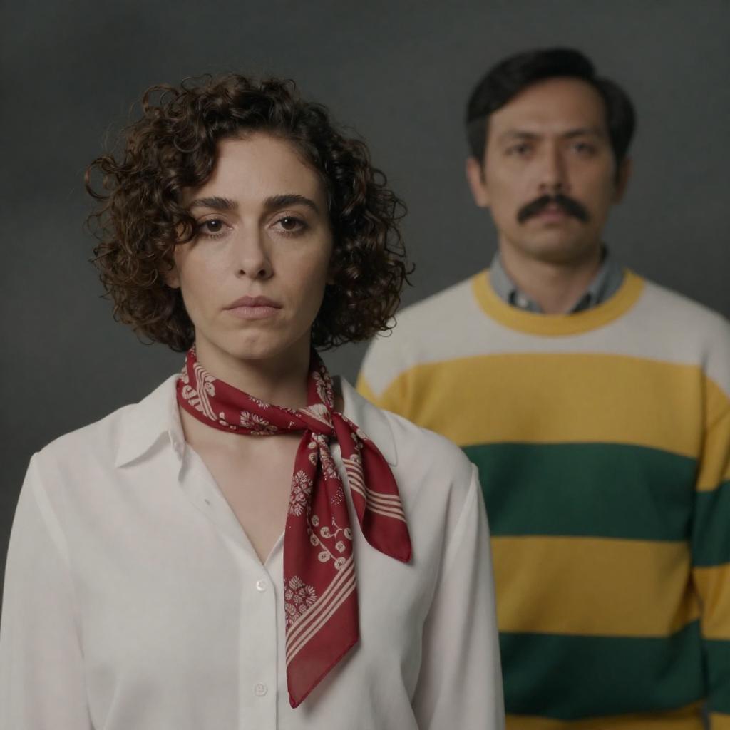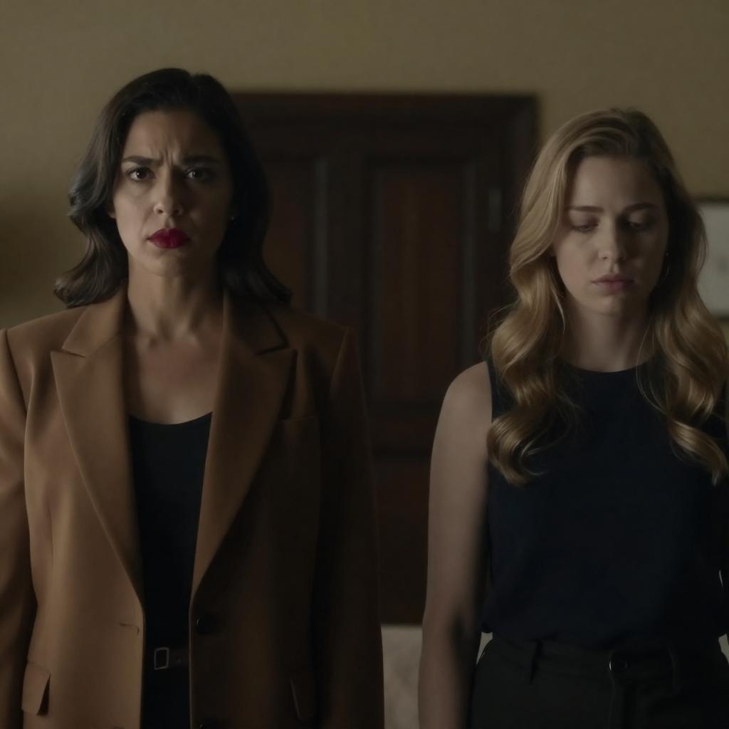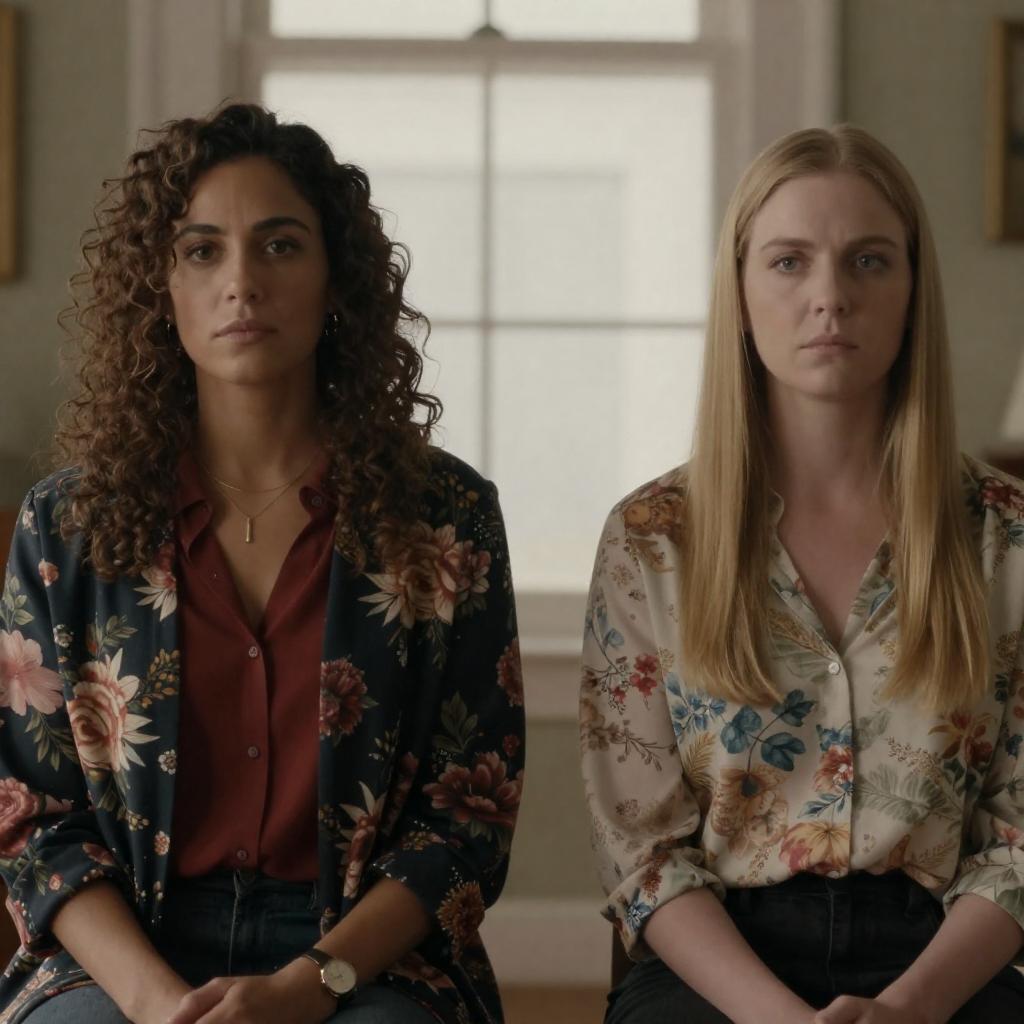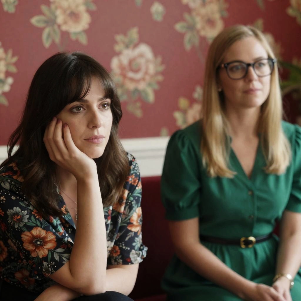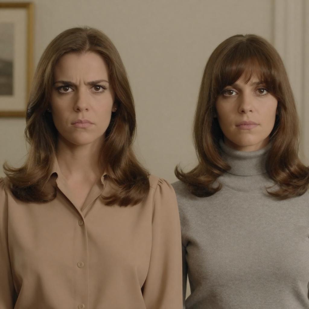 Photograph of two women with shoulder-length brown hair, wearing 1970s-style clothing. The woman on the left has a stern expression, light brown blouse with puffed sleeves. The woman on the right has a neutral expression, grey turtleneck. Blurred indoor background. Both women are centered, facing forward.
