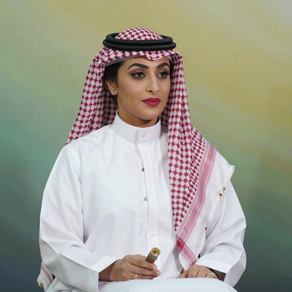 Photograph of a Middle Eastern woman with fair skin and red lipstick, wearing a white traditional thobe and a pink and white checkered keffiyeh. She is seated, holding a small object in her right hand, with a blurred green and yellow background. Her expression is calm and focused.