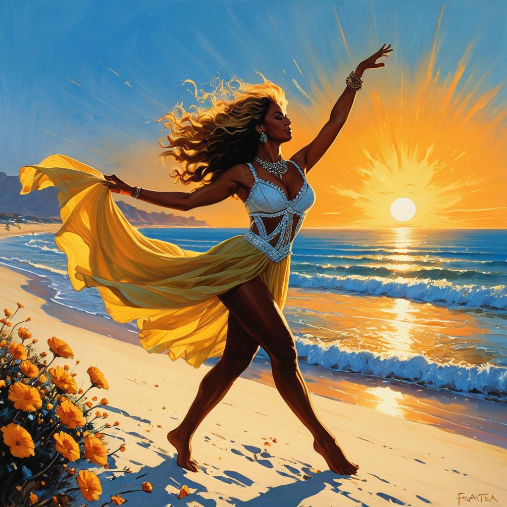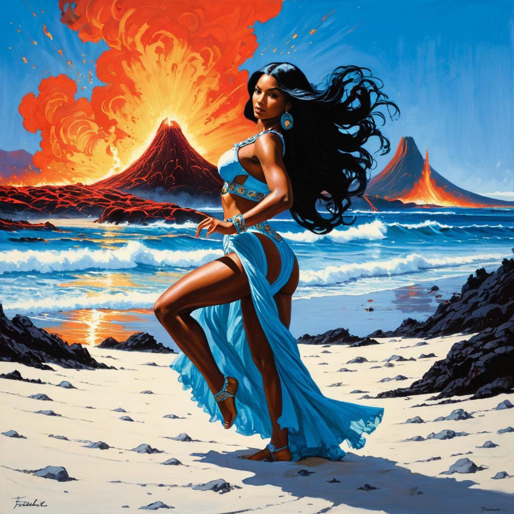 Painting by Frank Frazetta, Capture the essence of Halsey, a goddess of rebellion as she dances on the beach, surrounded by stormy skies and barren landscapes. The bright colors of the flowers create a stunning contrast against the white sand and blue ocean, drawing the viewer's eye to the goddess. She moves with a sense of grace and elegance, her flowing hair and dress adding to the overall sense of movement. This image should evoke a sense of joy and beauty, and transport the viewer to a world of love and romance.