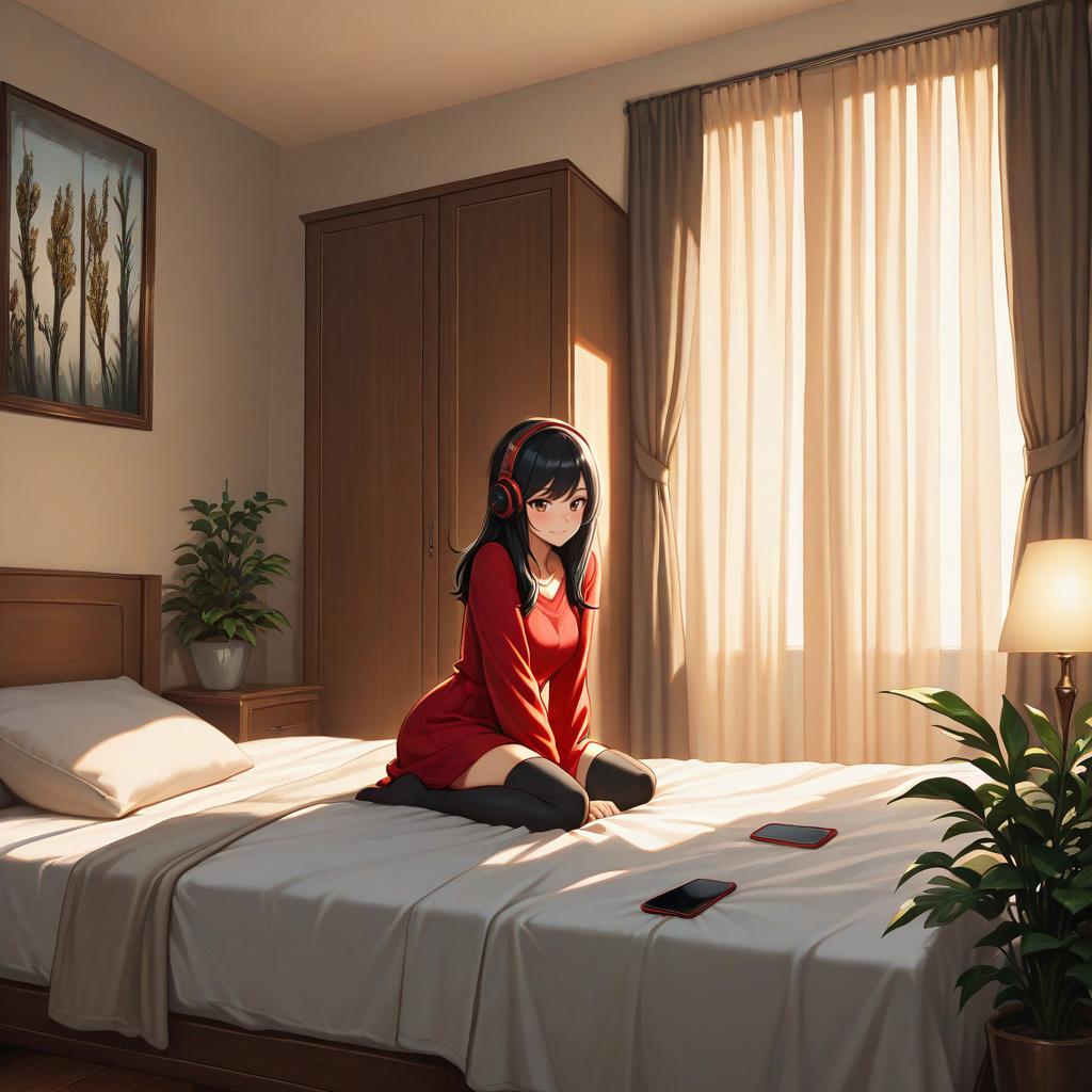 Illustration of a young woman with black hair and red eyes sitting on a bed in a warmly lit bedroom. She wears a red dress and black thigh-high socks, accessorized with large headphones. The room features natural light coming through sheer curtains, wooden furniture, houseplants, and a cozy, relaxed atmosphere.