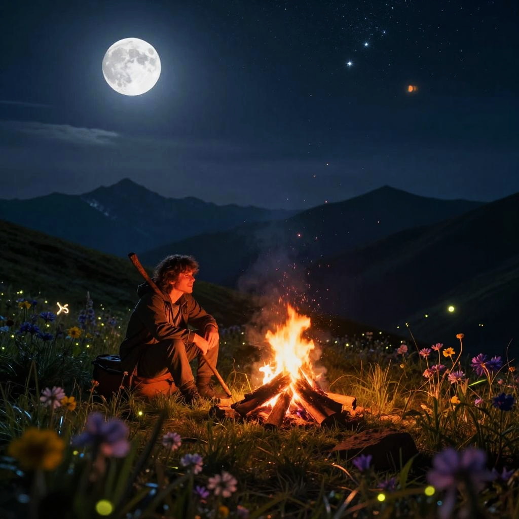 ASCII Masterpiece, (cosy), (ultra high res, mj, best quality, highly detailed:1.5), (cinematic), mythical nightscape in wind-swept hilltop among alpine wildflowers, featuring campfire with seated storyteller leaning on staff, infused with floating ember motes, laughing fire sprites, blooming magical herbs, sky full of stars, wild camping ambience, (fireflies:1.5), intricate environmental details, volumetric moonlight, ambient mist, long exposure trails, subtle godrays, cinematic depth of field, soft bokeh, natural film grain, high dynamic range, hyperrealistic photography, 8K, night, full moon, masterful composition, unreal engine lighting