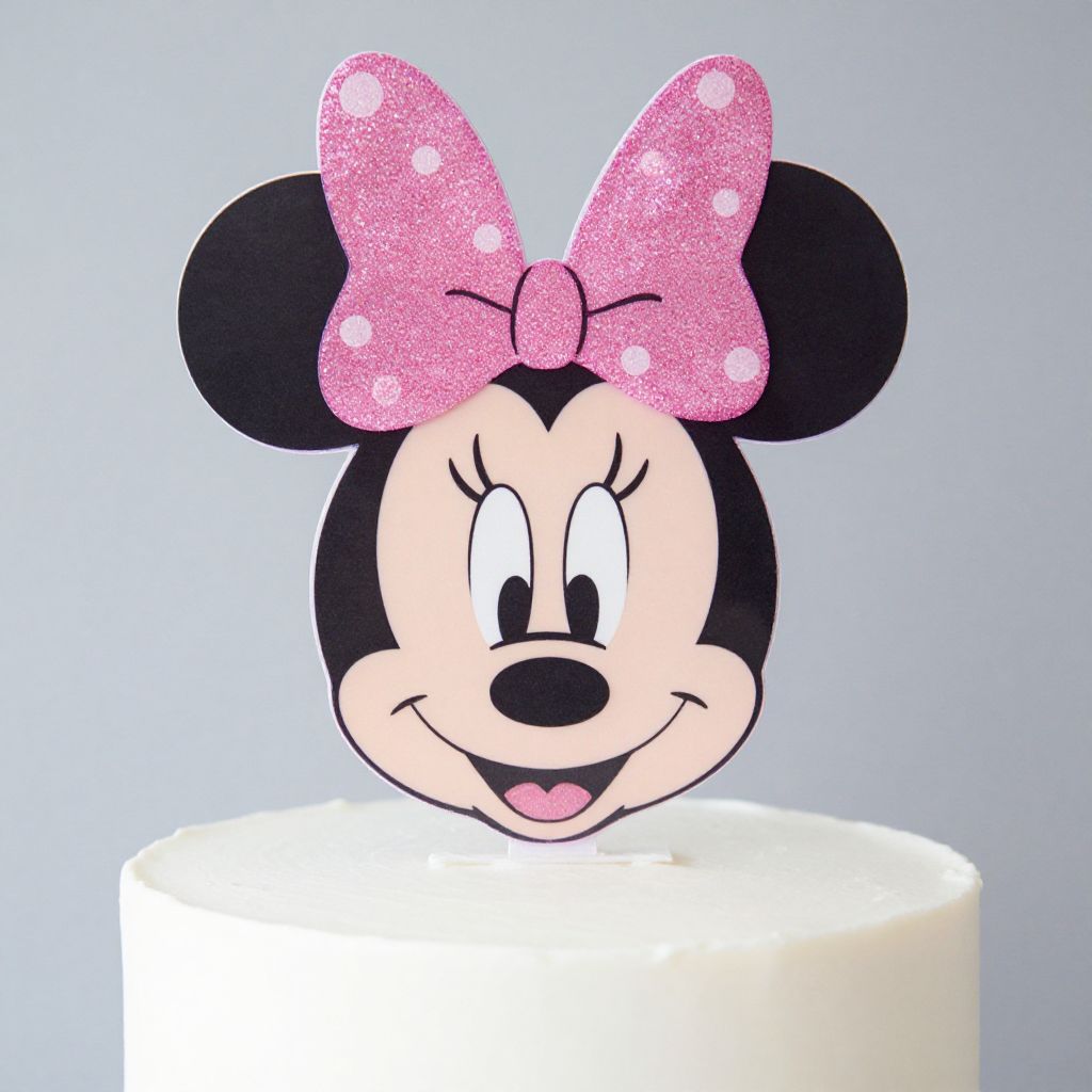 Shimmering Minnie Mouse pink glitter acrylic cake topper elegantly perched atop a smooth white frosted cake, featuring a classic bow silhouette design.