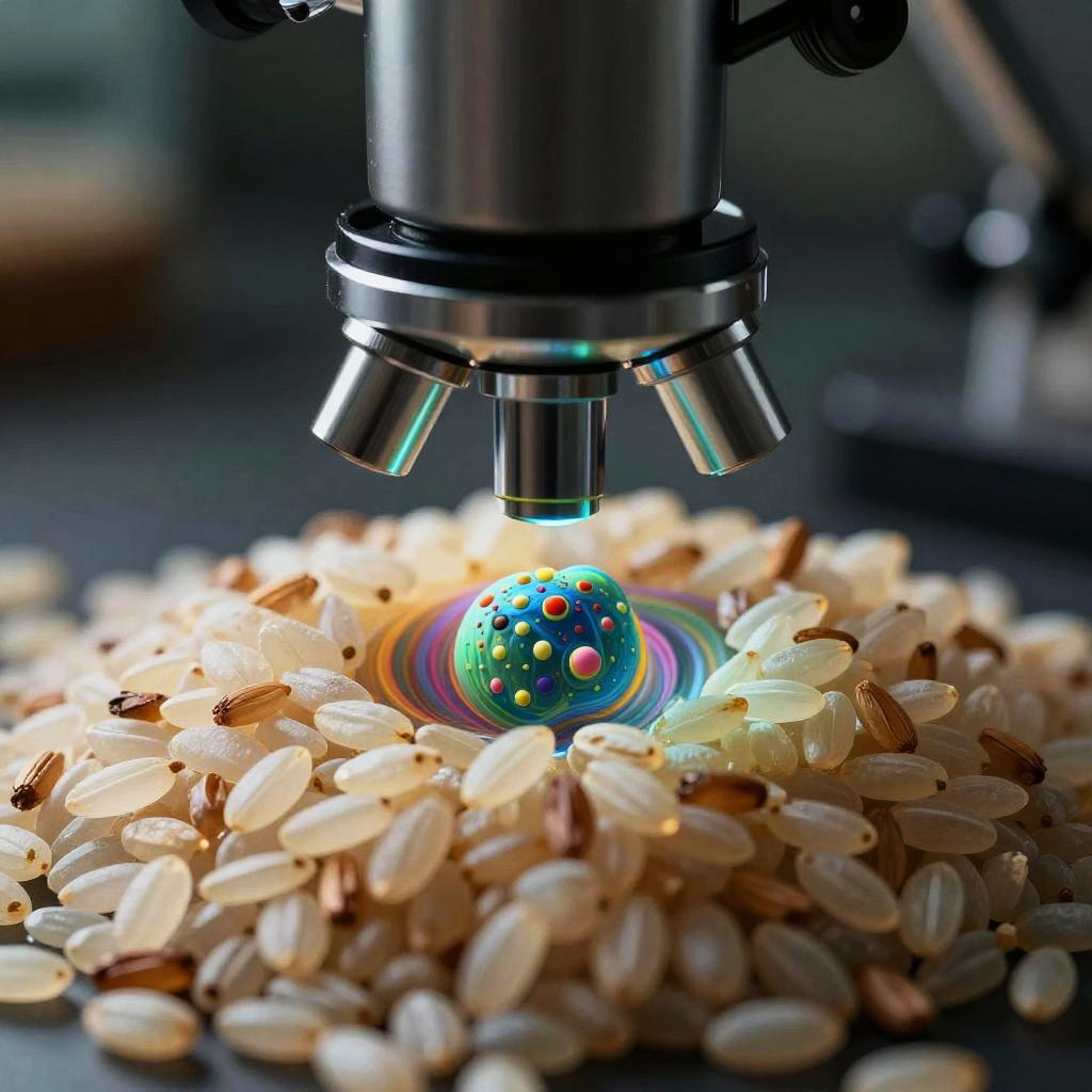 Grain of rice under microscope, stylized surreal image blending microscopic texture with abstract art, vibrant hues and swirling patterns, artistic interpretation of molecular structures