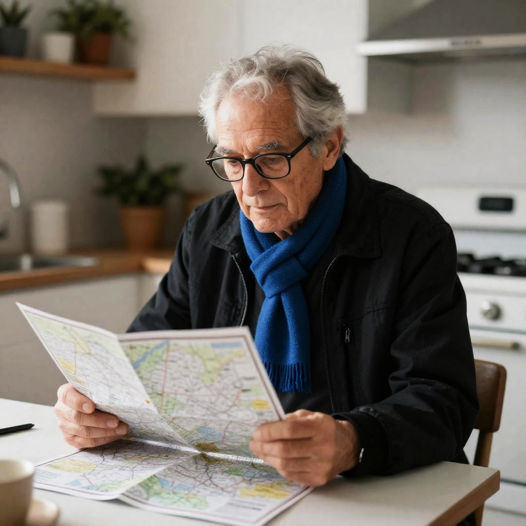 Middle-aged man with gray beard and plaid shirt, focused on assembling a blue puzzle on a wooden table. Beers, puzzle box, and coaster on table. Plaid couch behind him, colorful wall art and shelves in background. Casual indoor setting.