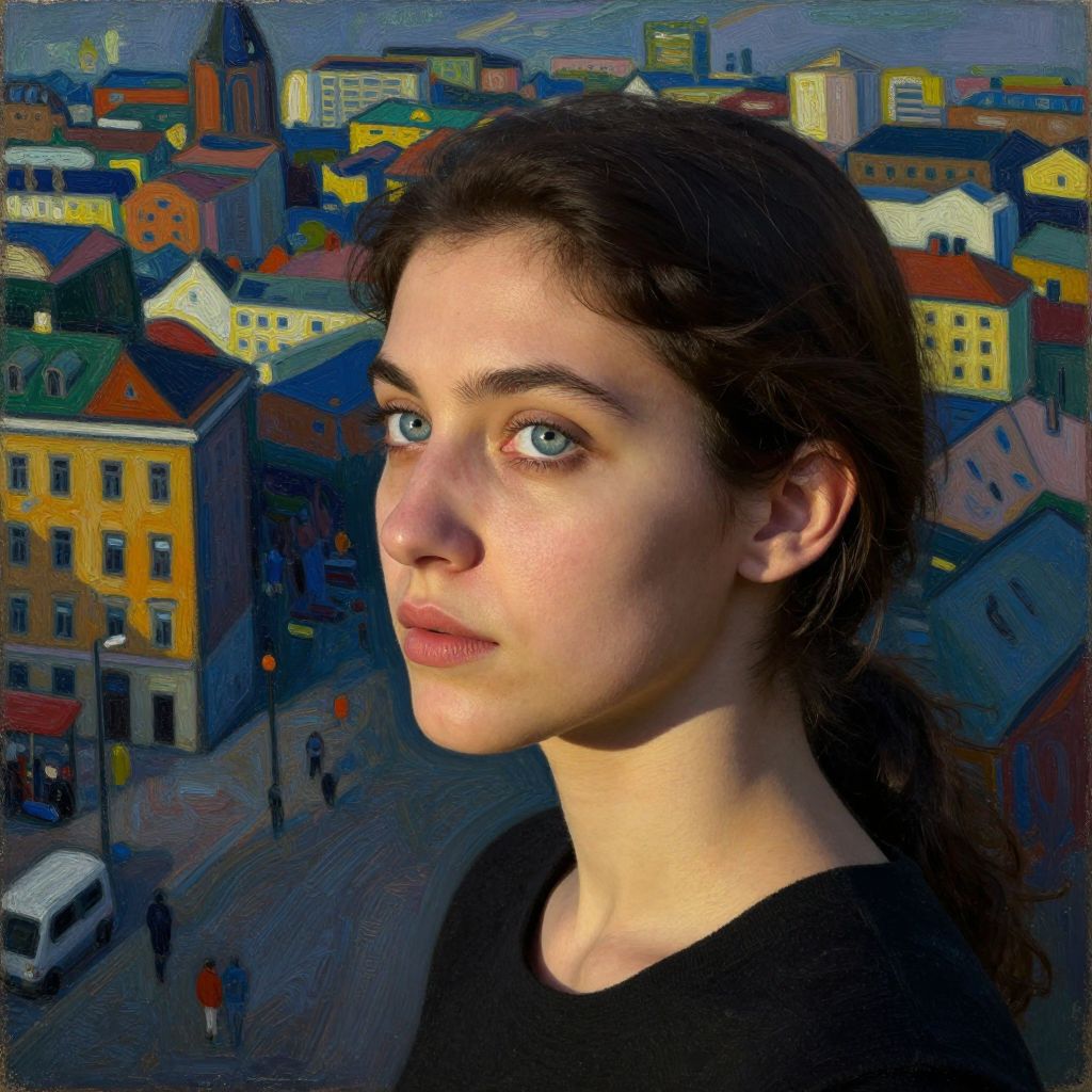 Digital painting of a young woman with fair skin, blue eyes, and dark hair, gazing forward against a colorful, impressionistic cityscape backdrop with