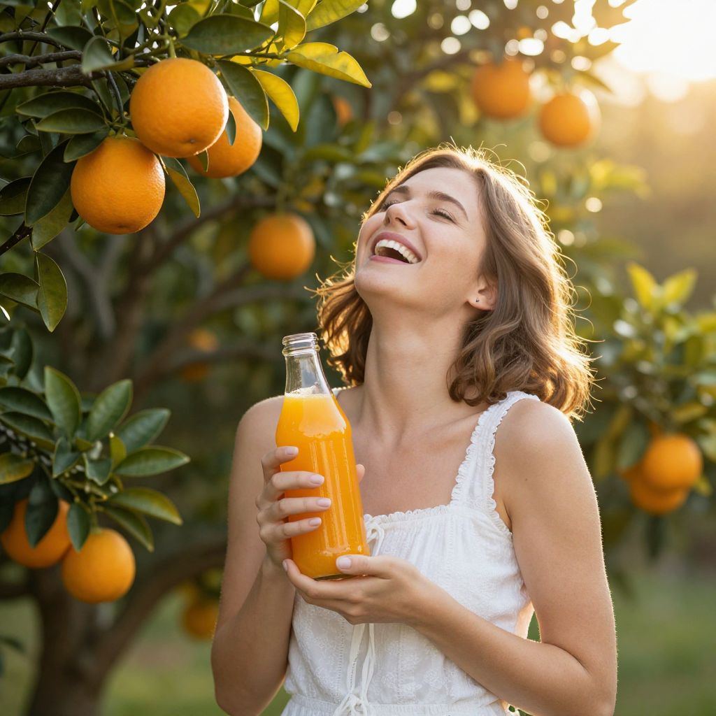 Woman holding a glass bottle filled with vibrant orange liquid, surrounded by lush citrus trees bearing ripe oranges, her laughter captured amidst the golden glow of sunlight filtering through the foliage.
