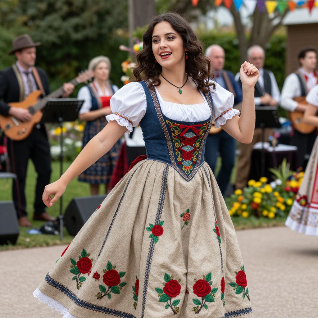 A vibrant, high-resolution photo of a woman with wavy dark brown hair and a cheerful expression wearing a detailed quince guest dress, the costume featuring a fitted bodice and full-skirted design with embroidered rose patterns, dancing in a festive garden during a cultural festival with music and guests in the background.. The woman has big breasts and cute face