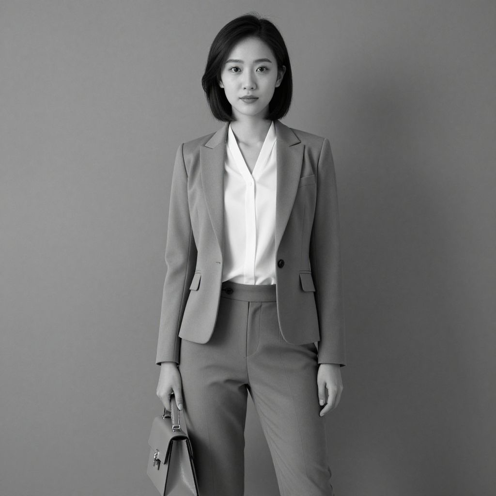 This is a black-and-white photograph of an Asian woman with a straight bob haircut, standing against a plain gray background. She is wearing a light-colored, tailored blazer over a white dress shirt, paired with high-waisted, straight-leg pants. In her right hand, she holds a small, structured handbag with a flap and a clasp. She has a neutral expression, looking directly at the camera. The lighting is soft, casting a subtle shadow to her right. The overall style is minimalist and professional, highlighting her poised and confident demeanor.