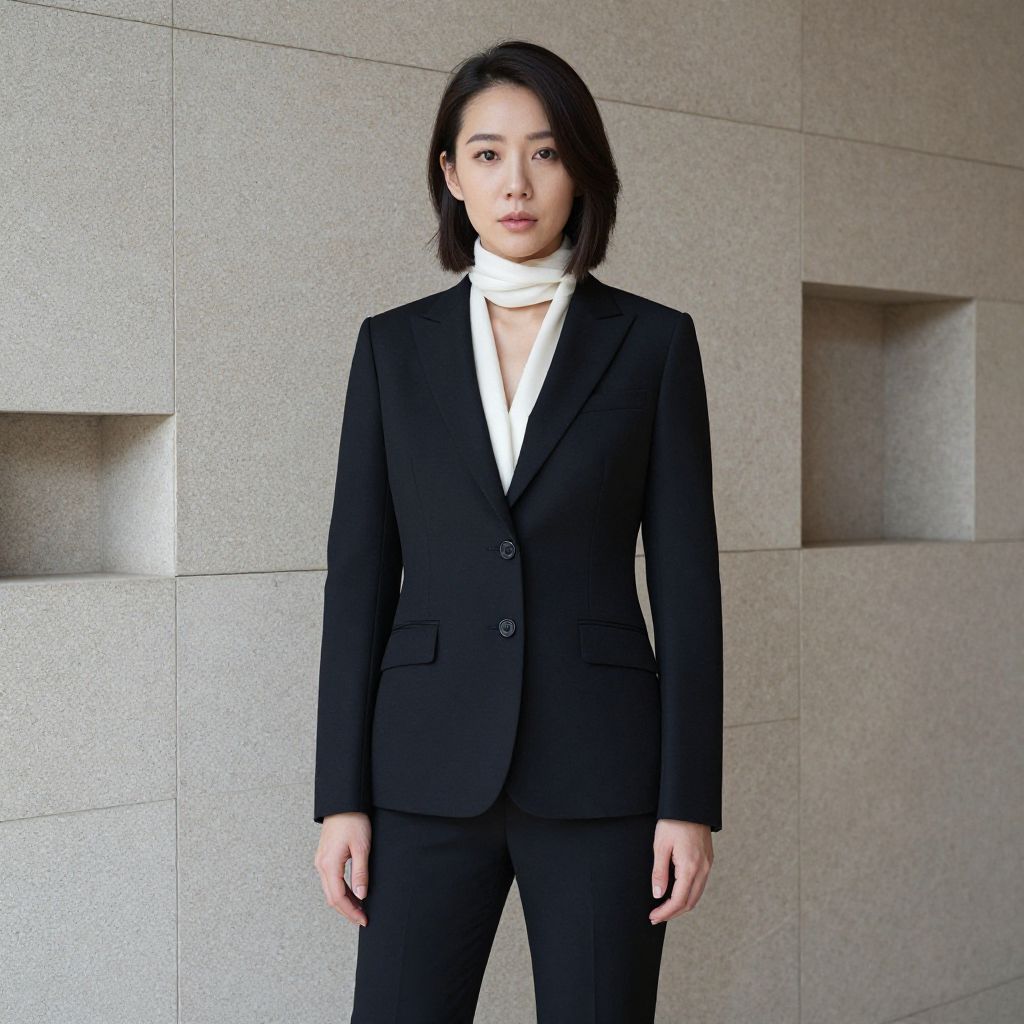 Black-and-white photograph of an Asian woman with shoulder-length black hair, wearing a light-colored blazer, white shirt, and high-waisted pants