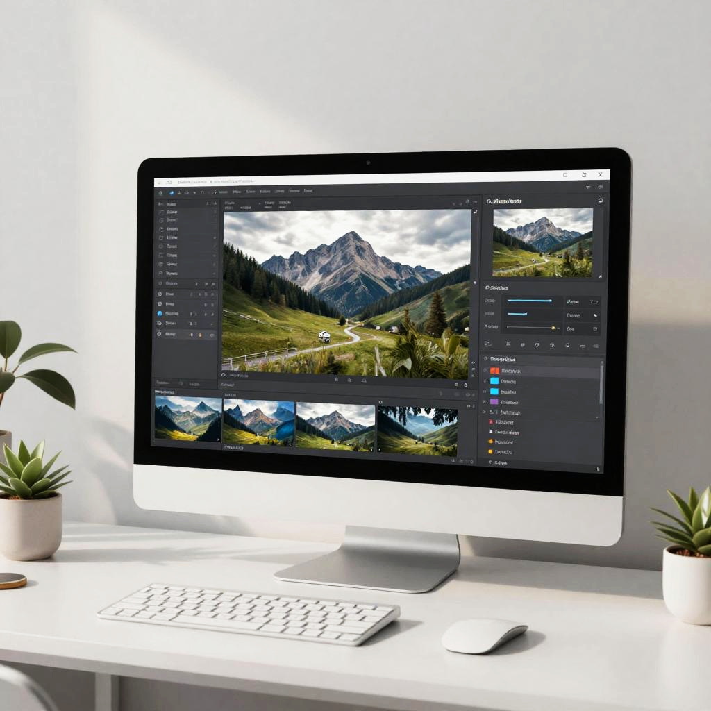 Ai image editor free environment, a clean minimalist desktop setup with a large touchscreen displaying advanced AI photo editing, modern and intuitive UI elements, soft natural lighting, futuristic digital workspace, 4K detailed style