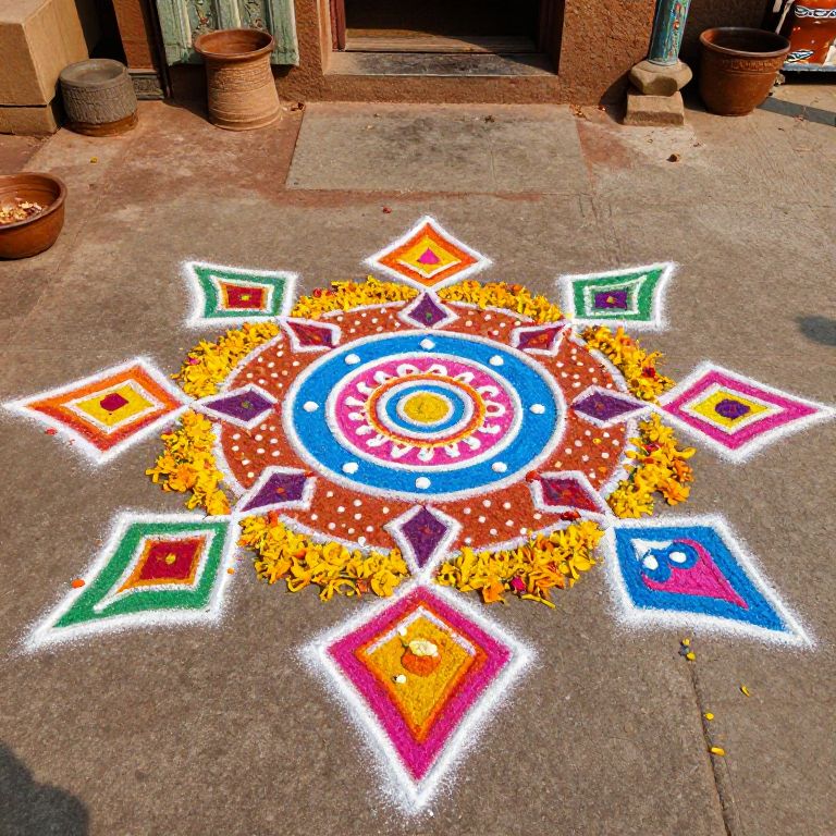 Rangoli exquisite hand-crafted colorful patterns made with chalk powder and flower petals, traditional Indian artistic expression, outdoor village setting with natural light, rich cultural details and artistic symmetry