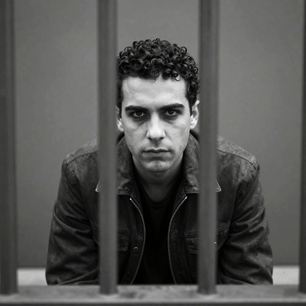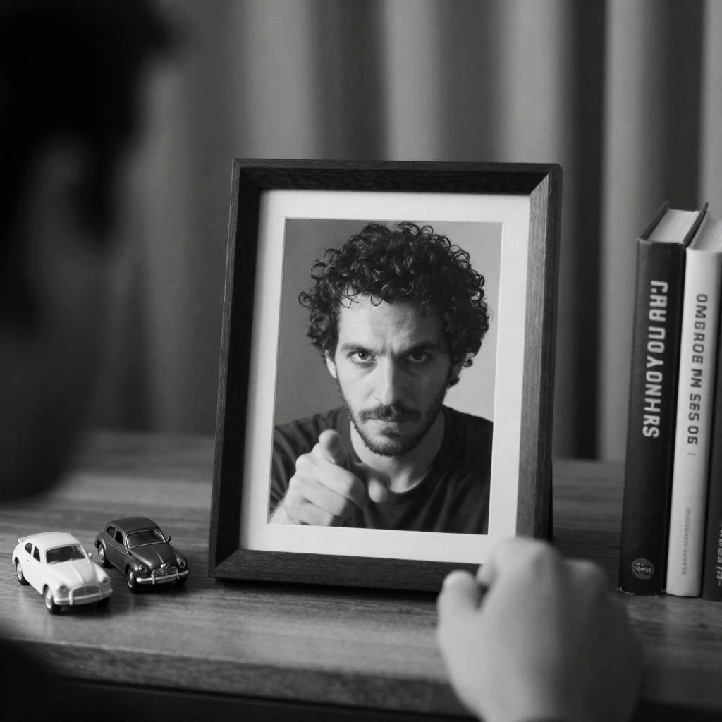 Black and white photograph of a man with curly hair, intense gaze, and slight beard, pointing with fingers. He's in a framed picture on a wooden desk. Two small toy cars are on the left. Blurred hand in foreground. Books with spines on the right. Vertical curtains in background.