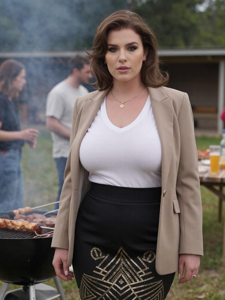 A voluptuous woman in a light brown blazer, white V-neck T-shirt, and black pencil skirt with a golden geometric pattern, stands confidently at a BBQ gathering at the farm. Visual style: Medium format film. Sexy. Pretty face and beаutiful eyes. Big breasts