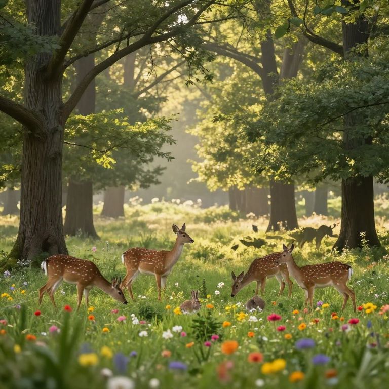 Amigable forest glade at sunrise with animals like deer, rabbits, and birds peacefully interacting, soft light filtering through tall trees, lush greenery and colorful wildflowers, tranquil and welcoming nature scene, hyper detailed natural textures and harmonious composition.