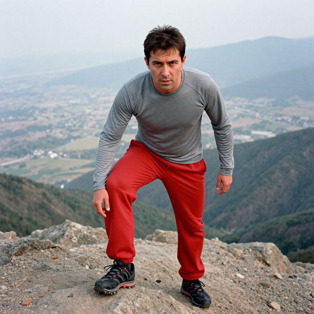 A man, long-sleeve performance top, heather gray, bright red joggers, black trail running shoes, rugged grip, mountain summit, rugged terrain, panoramic valley view, chromogenic film, focused expression, determination in his eyes. Man has masculine face and piercing eyes
