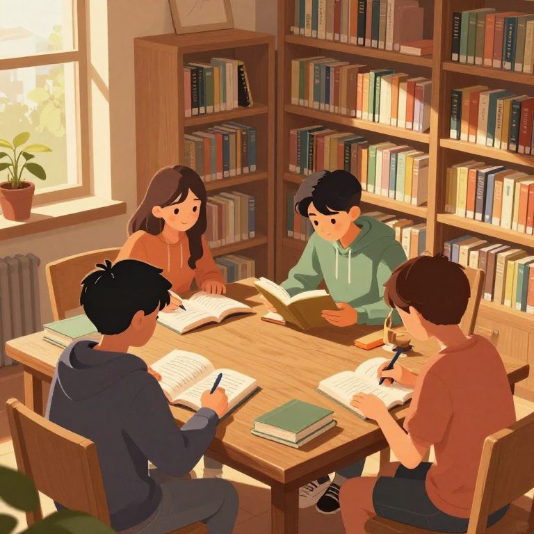 Digital illustration of four students gathered around a wooden table in a cozy, sunlit library corner. The students, wearing casual clothing like hoodies and t-shirts, are reading books and writing notes, creating an inviting and studious atmosphere. The library has warm tones, detailed bookshelves filled with books, and soft shadows enhancing the peaceful mood.