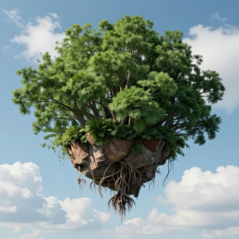 Photorealistic CGI of a floating tree with lush green foliage, roots dangling, against a bright blue sky with fluffy white clouds.