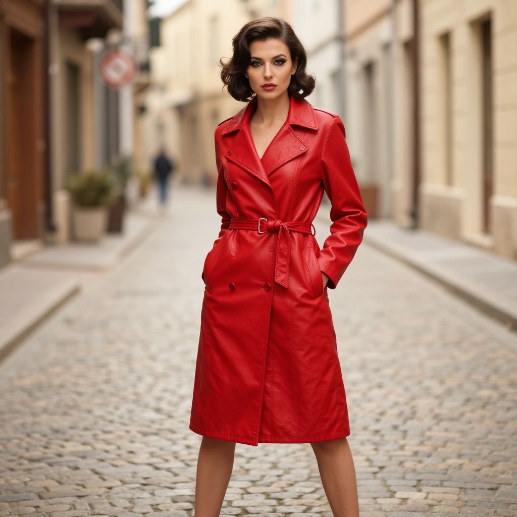 The image showcases a striking woman in a vibrant red leather coat, standing confidently in a charming cobblestone street. Her bold hairstyle and makeup enhance the artistic flair of the scene, evoking a fashionable and cinematic atmosphere.