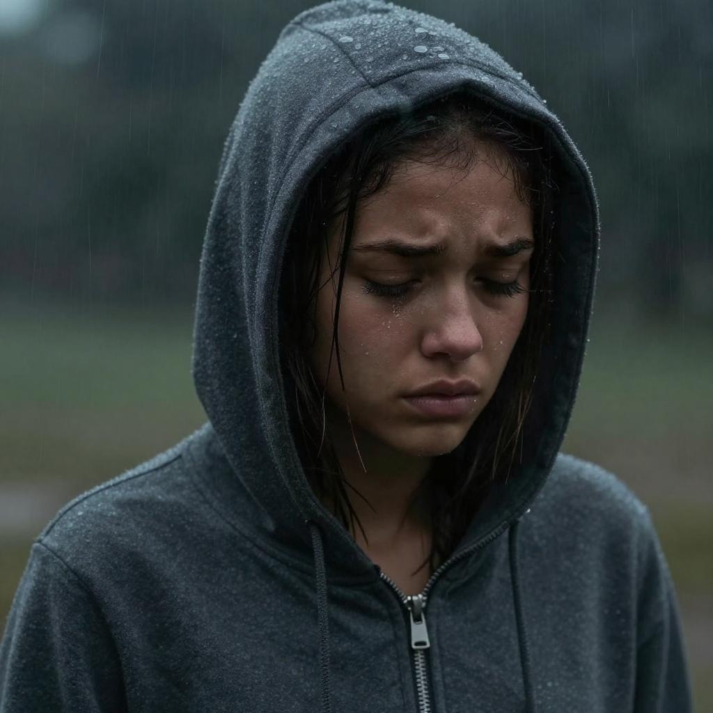 Photograph of a sad, wet-faced young girl with dark hair, wearing a soaked gray hooded sweatshirt, standing in the rain.