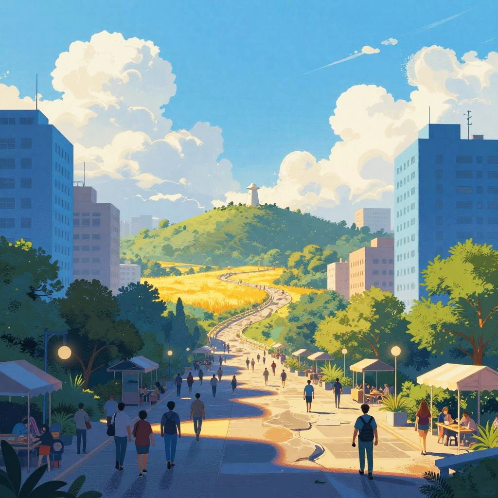 Digital pop art landscape set in busy city square at golden hour, bright blue sky with fluffy clouds. Oversized blue-tinted shapes frame a rocky path winding into a glowing golden field; a small landmark rests on a distant hill amid lush greenery. Saturated palette, crisp outlines, dithered textures, soft bloom, subtle fog, playful particles, storybook charm, vibrant and optimistic.