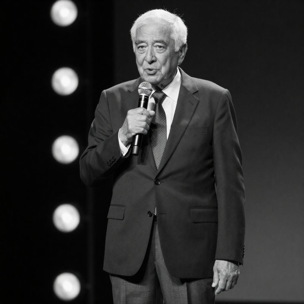 Black-and-white photograph of an older man with white hair, wearing a dark suit, tie, and checkered pants, holding a microphone. He stands in front of a stage with circular lights. Intense facial expression. One person.