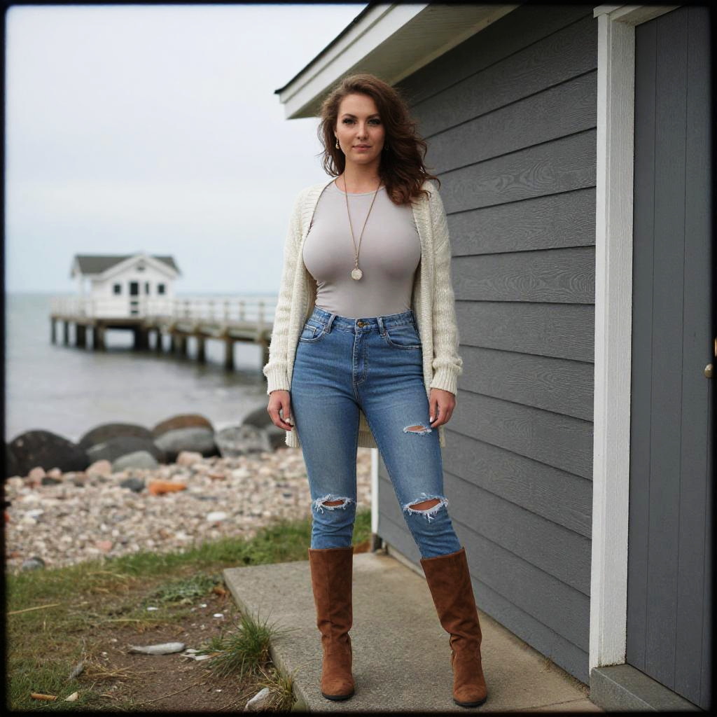 A svelte woman in a light grey long-sleeve top and ripped blue skinny jeans, layered with a cream cardigan, stands at a seaside cottage with a fishing pier, wearing long brown ankle boots and a long pendant necklace. Visual style: lomography analog photo. Sexy. Pretty face and beаutiful eyes. Big breasts