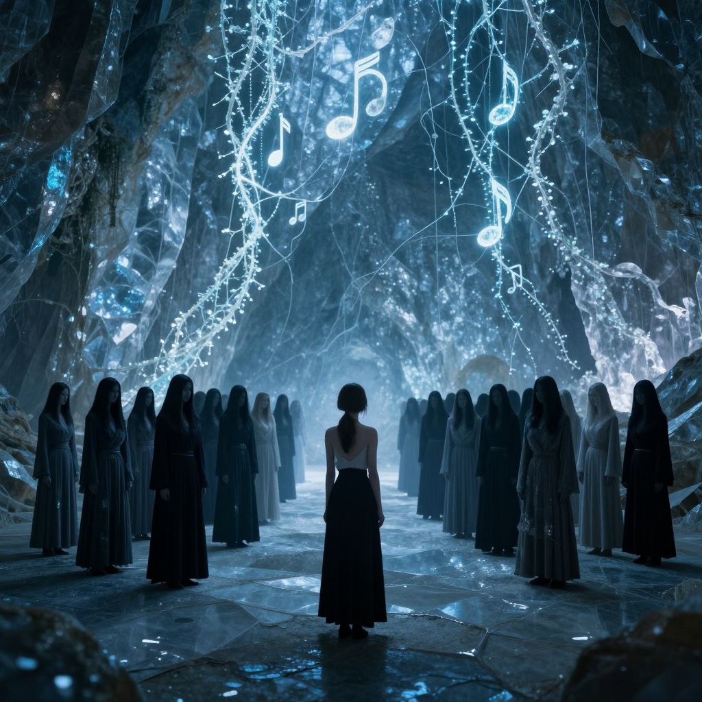 This digital artwork depicts a dark, cavernous room illuminated by glowing, musical notes hanging from the ceiling. A lone, silhouetted figure with short hair, wearing a sleeveless top and long skirt, stands in the center, facing the crowd. The crowd consists of hooded figures dressed in flowing robes, arranged in a semi-circle. The cavern walls and floor are textured with rough, rocky surfaces. The blue and white lighting creates a mystical atmosphere, with the musical notes adding a magical, ethereal quality. The image combines elements of fantasy and mystery, evoking a sense of anticipation and enchantment.