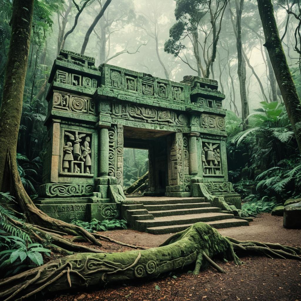 A 3D rendered sculpture of an ancient stone gateway located in a misty rainforest clearing. The structure features detailed weathered stone carvings and ornate designs influenced by archaeological art, surrounded by lush green foliage and moss-covered roots. The scene is depicted in soft emerald greens and muted ochres, blending natural elements with artistic textures inspired by the Pont-Aven school.