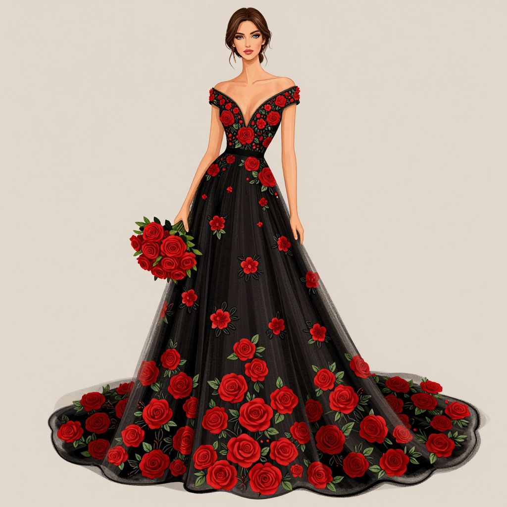 Elegant fashion illustration by Olivia Elery showcases a woman in a striking off-the-shoulder gown featuring a deep V-neckline adorned with intricate red floral embroidery, complemented by a flowing skirt that cascades into a train embellished with vibrant red roses, while she gracefully holds a bouquet of matching blooms in her hand.