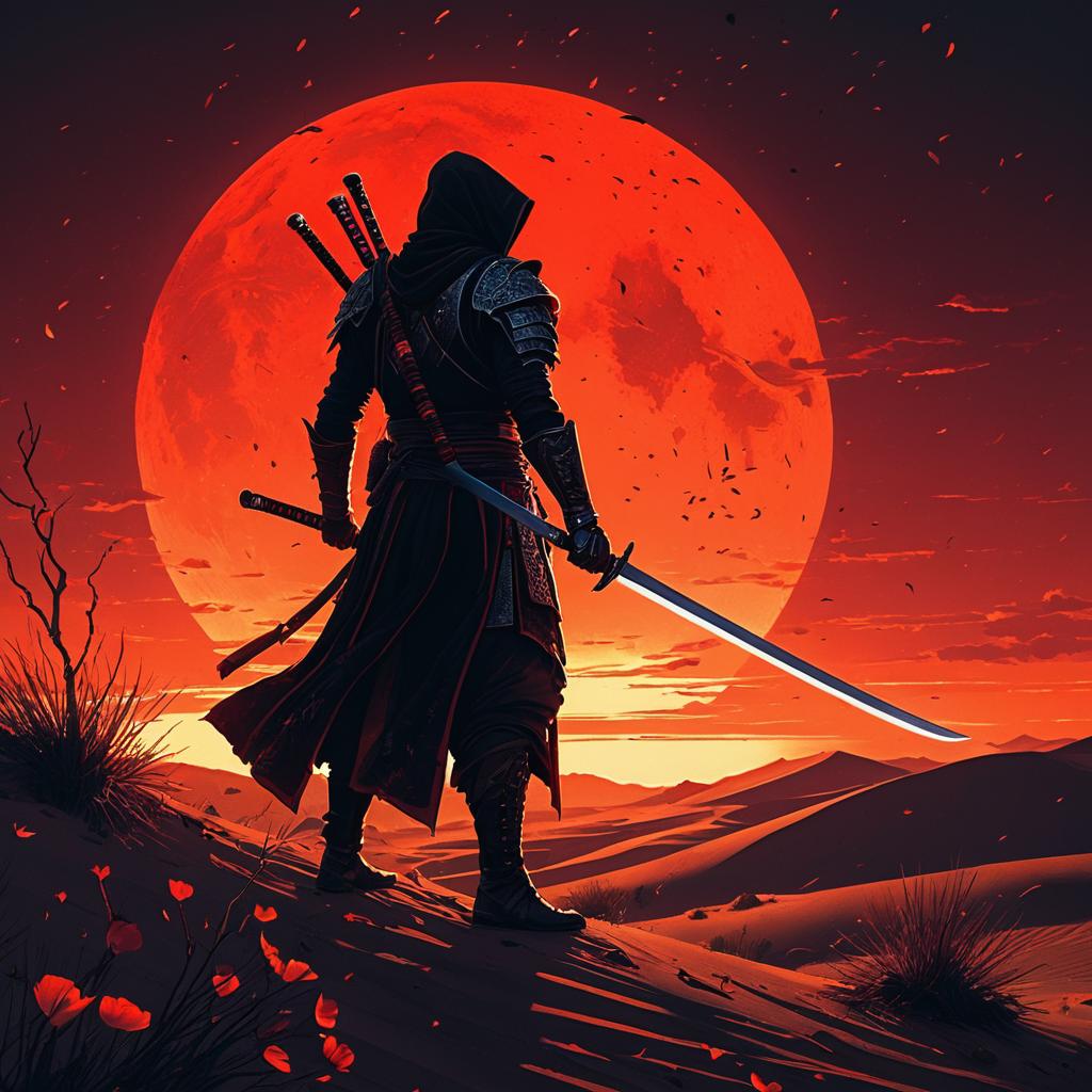 A mystical desert warrior clad in ethereal armor stands on a dune ridge beneath a blood-red sunset. The figure is armed with multiple katanas, one held ready while others are sheathed on the back. Ghost-fire embers flicker across the armor, and drifting cherry petals fill the shadowy landscape. The dramatic lighting highlights the detailed textures and silhouette against the massive, glowing red sun in the background.