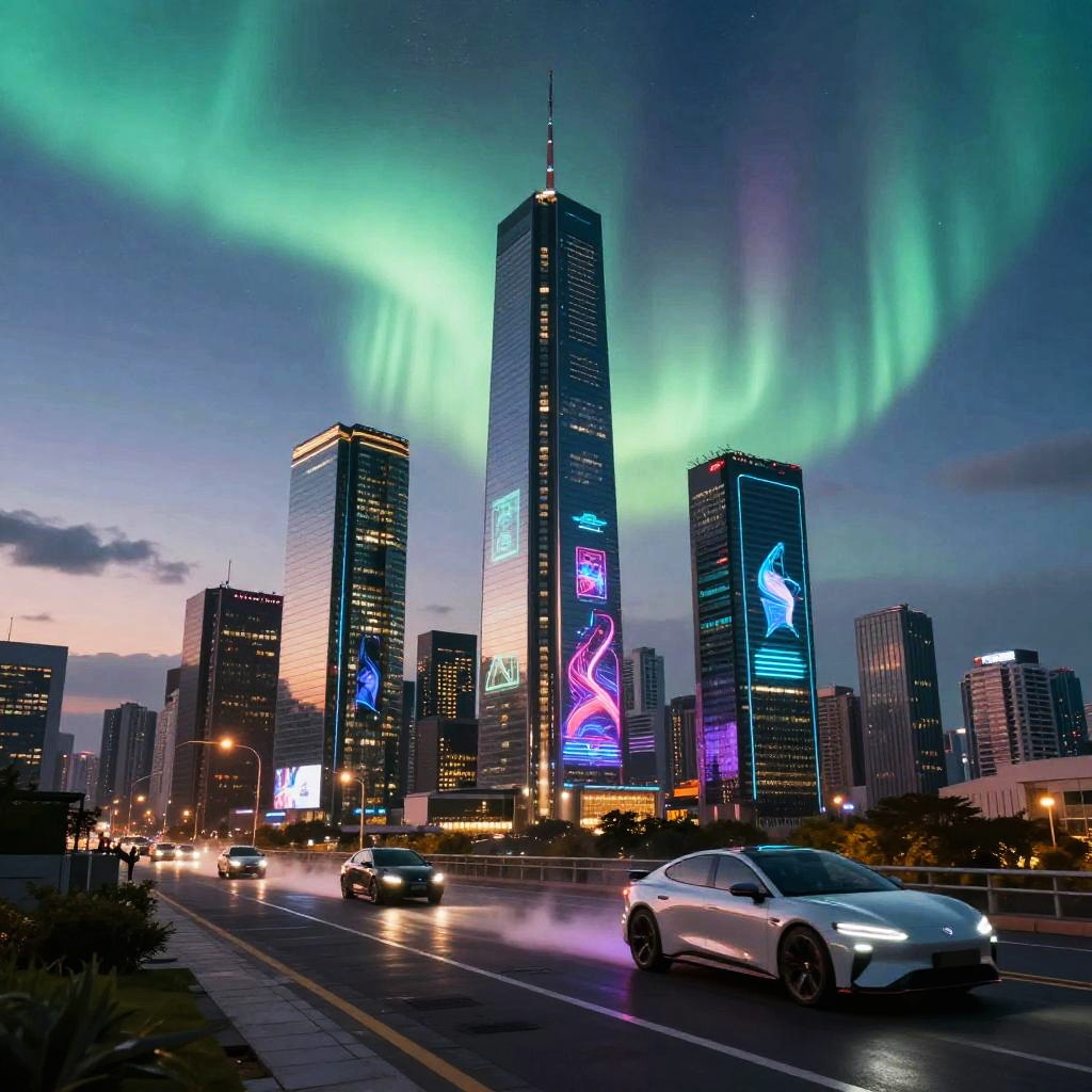 Futuristic city skyline at dusk featuring neon-lit skyscrapers with holographic advertisements. A vivid aurora borealis glows brightly overhead, casting atmospheric colors across the sky. Sleek modern cars with illuminated headlights drive on a wet road, reflecting the vibrant urban lightscape, creating a high-tech, cyberpunk-inspired scene.