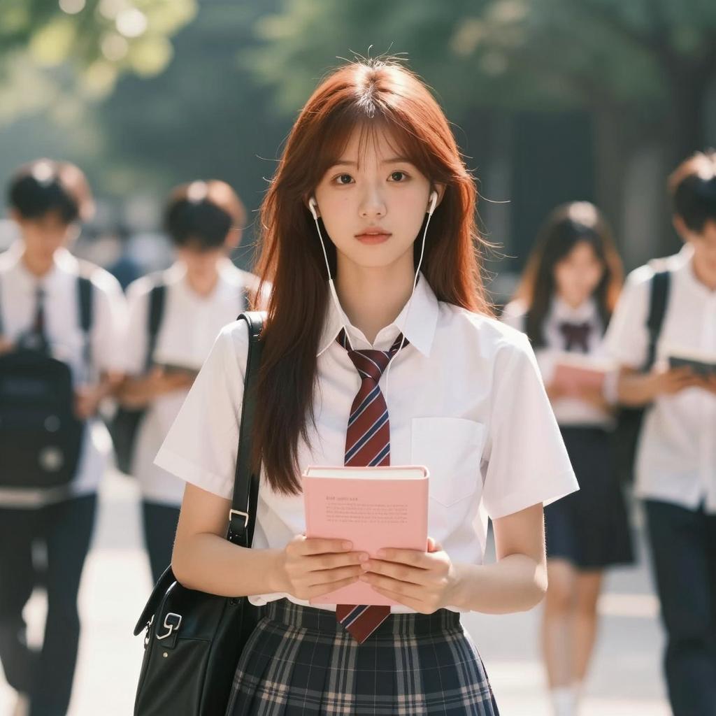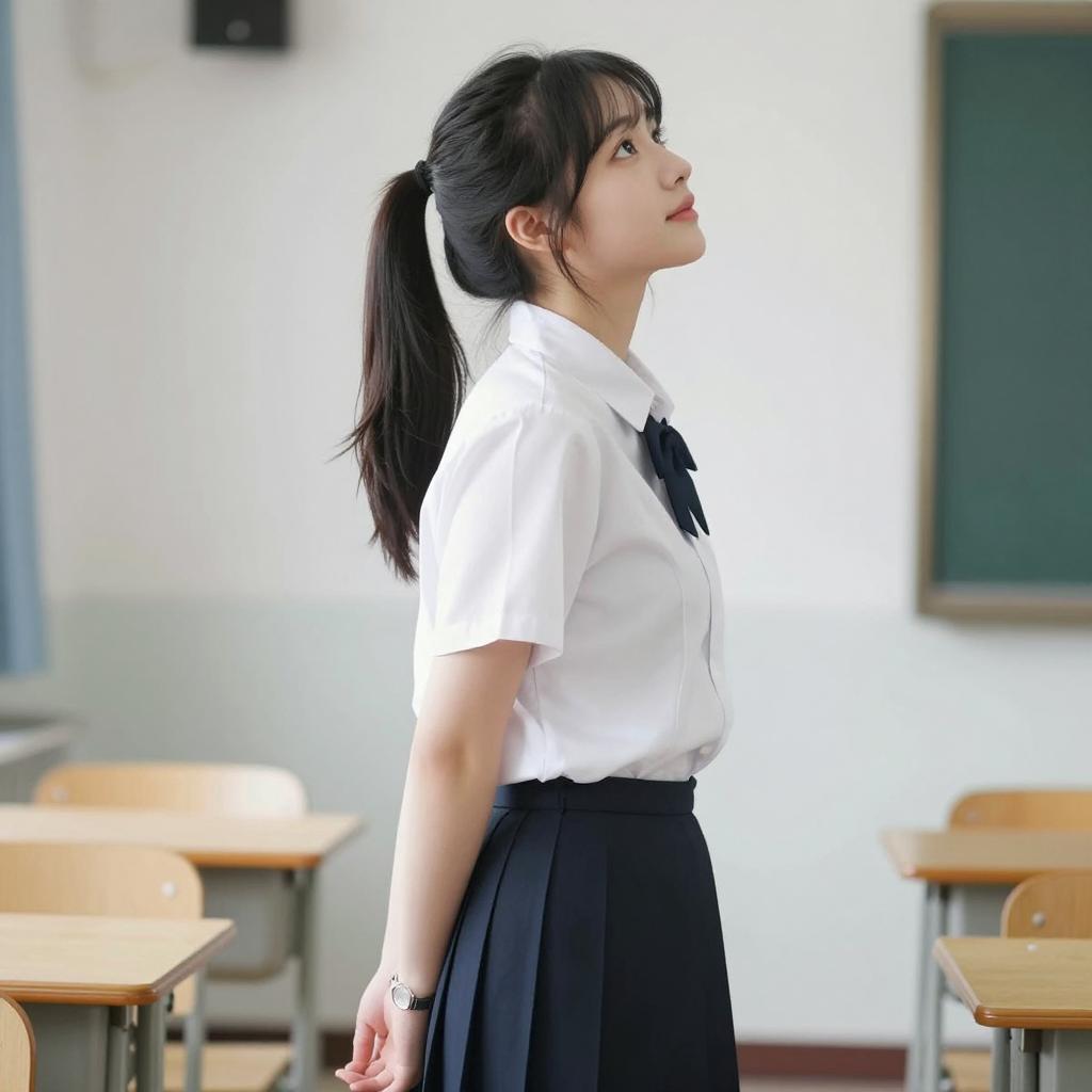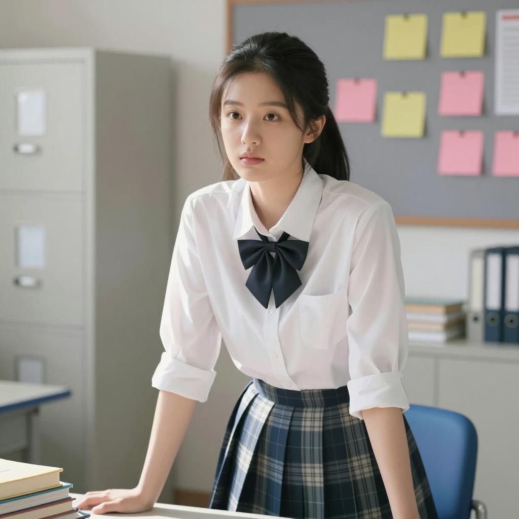 Asian woman with long black hair, wearing white shirt, blue and white plaid skirt, holding yellow pencil to mouth, sitting at desk, writing in notebook, sunlight from left, classroom background, whiteboard on wall, book on desk, black chair, legs crossed.