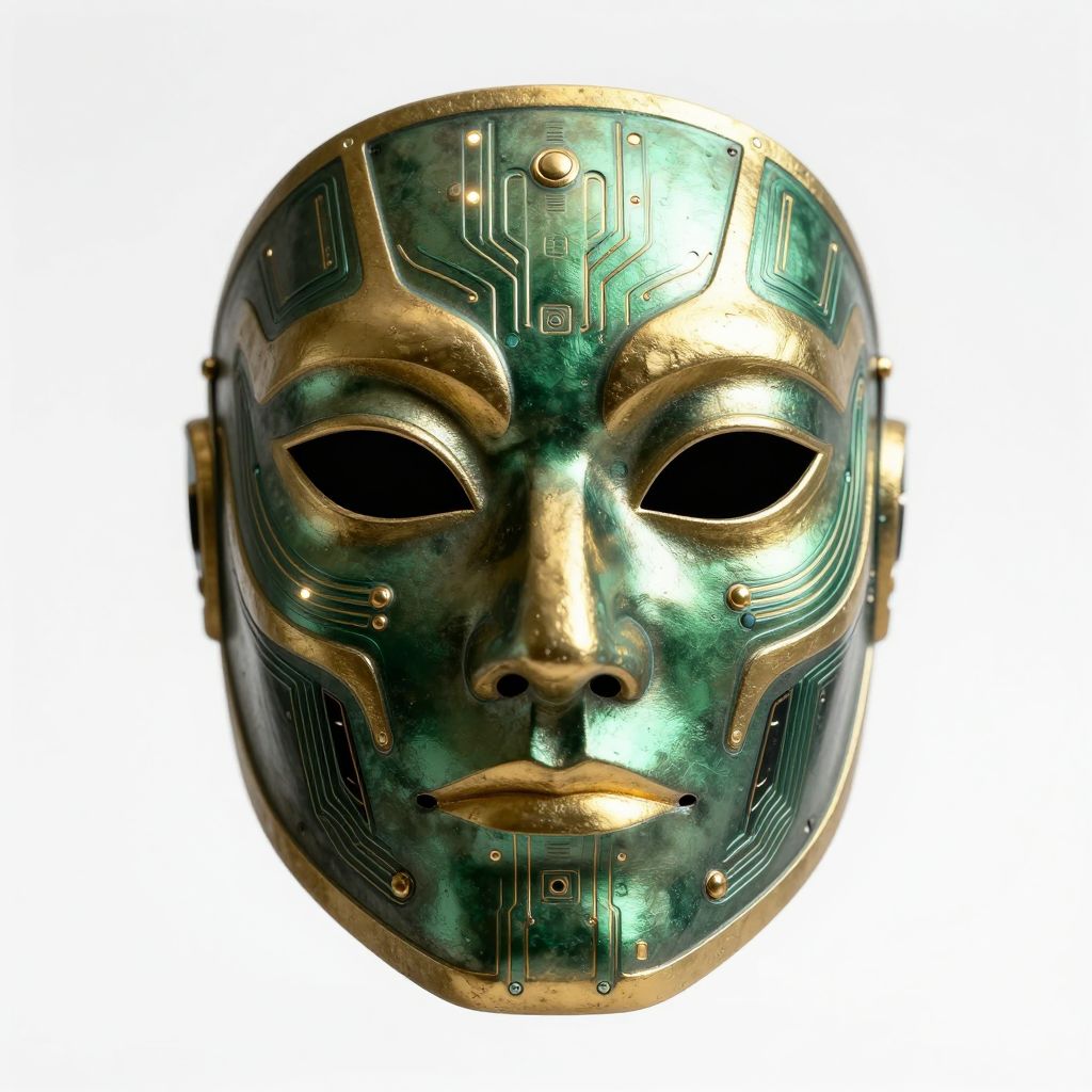 Highly detailed digital artwork of a futuristic cybernetic face mask with a green and gold metallic finish. The mask features intricate circuitry patterns and glowing lights, combining elements of technology and ancient design in a symmetrical, robotic visage.