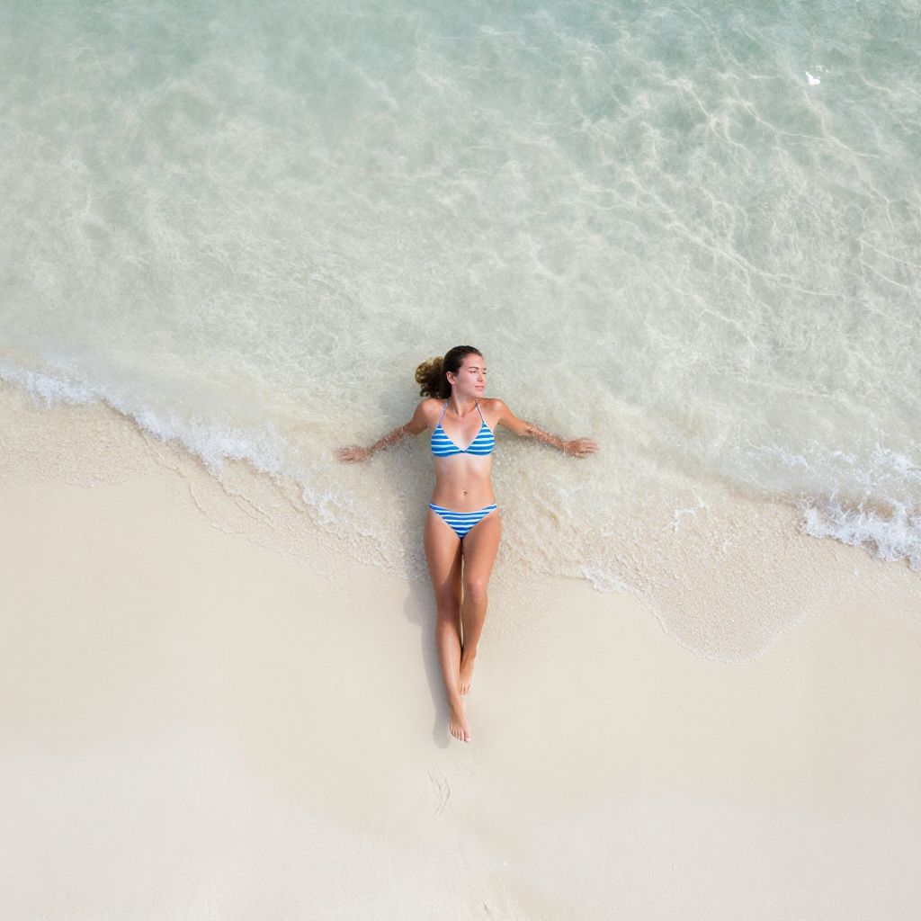 Photograph of a tan-skinned woman in a blue-striped bikini, lying on a sandy beach with clear, shallow ocean water around her.