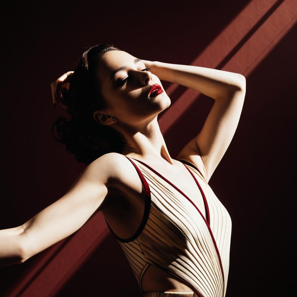 Minimalist portrait of a graceful female dancer in mid-pose wearing a cream and burgundy outfit with gold accents. The image features bold red lips, dramatic diagonal light and shadow, and a sleek, sophisticated art deco inspired aesthetic with high contrast and a vintage illustration style.