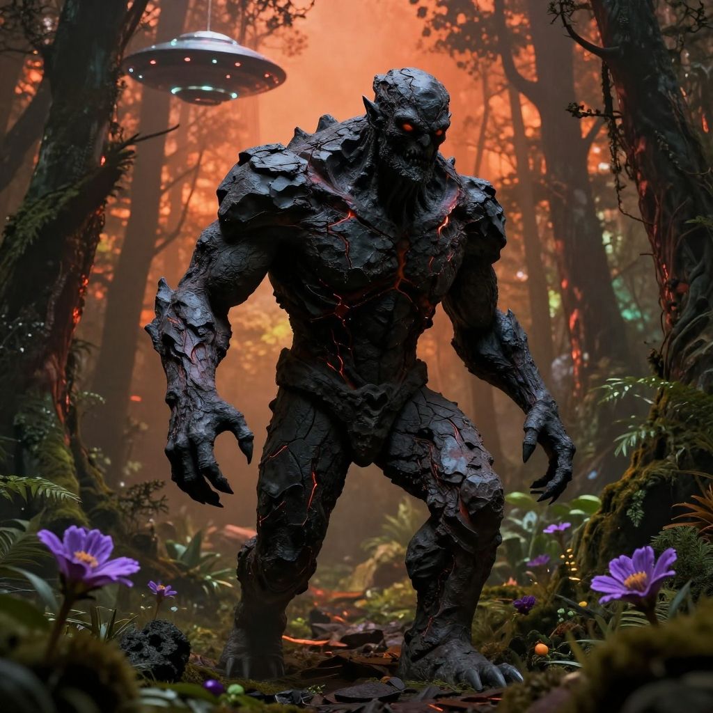 A very remote forest flown over by a ufo in horror style, Evil obsidian golem description: the obsidian golem is a living statue carved from dark, volcanic rock. its 8k texture reveals intricate cracks and molten veins that move as it marches with weighty physics. unreal 5, dark glow, A beautiful purple flower in a dark forest, in the style of hyper-realistic sculptures, dark orange and green, post-apocalyptic backdrops, light red and yellow, museum gallery dioramas, soft, dreamy scenes, orange and green