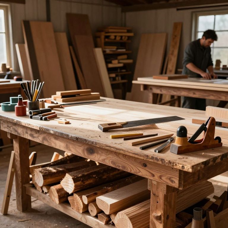Woodshop interior showcasing a large workbench cluttered with chisels, saws, and planes, fresh logs and timber stacked neatly, sunbeams highlighting the textures of wood grain, a skilled artisan shaping furniture components, creating a cozy and industrious vibe.