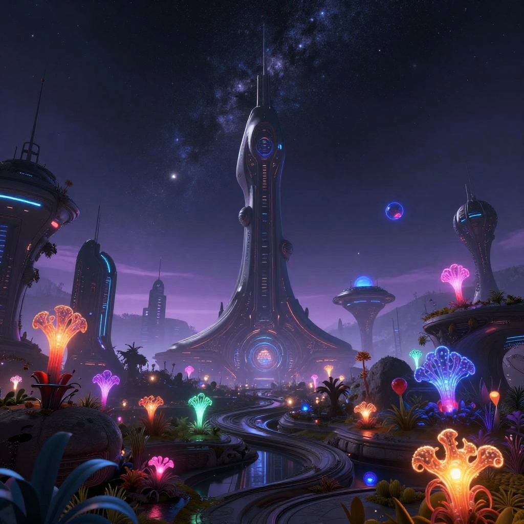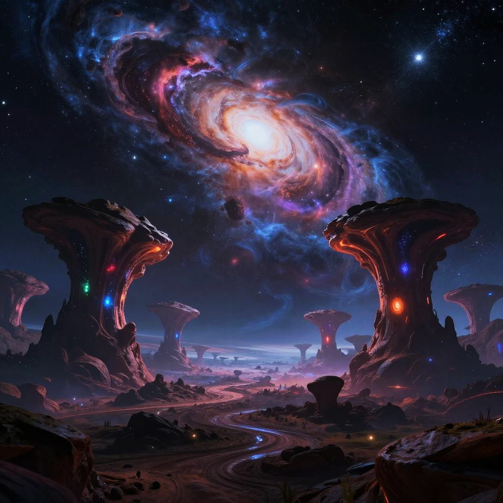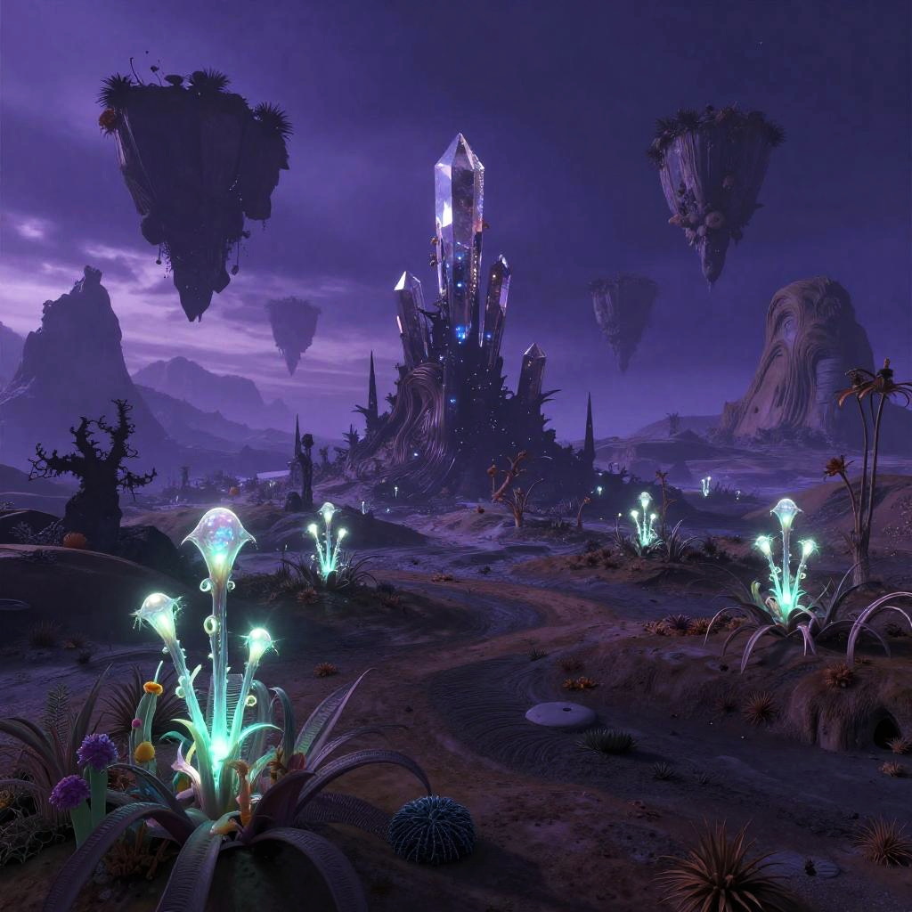 Unearthly landscape with glowing alien plants and floating crystalline formations under a purple sky, mysterious atmosphere, surreal lighting, wide-angle view, intricate details in flora and terrain.