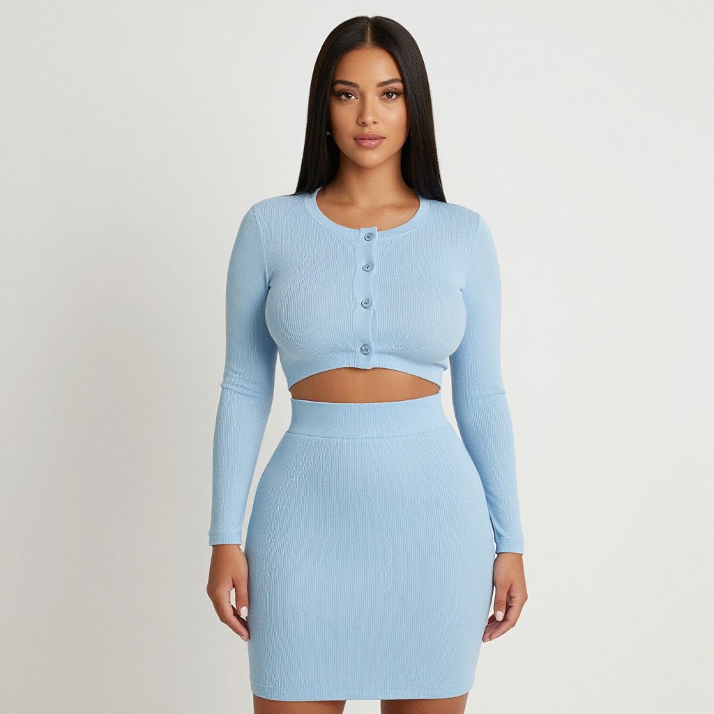 Photograph of a plus-sized woman with long, straight black hair, light brown skin, and full lips. She wears a light blue, long-sleeve, ribbed crop top with three buttons down the front, exposing her midriff. She also wears a matching light blue, ribbed, high-waisted skirt that fits snugly, highlighting her curves. The background is plain white, making her and her outfit the focal point. She stands facing the camera with a neutral expression. The image is brightly lit, emphasizing the texture of the ribbed fabric.