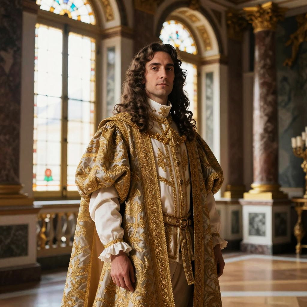 Portrait of a nobleman wearing a royal mantle, detailed brocade fabric with gold threads, standing in a richly decorated palace hall with marble pillars and stained glass windows