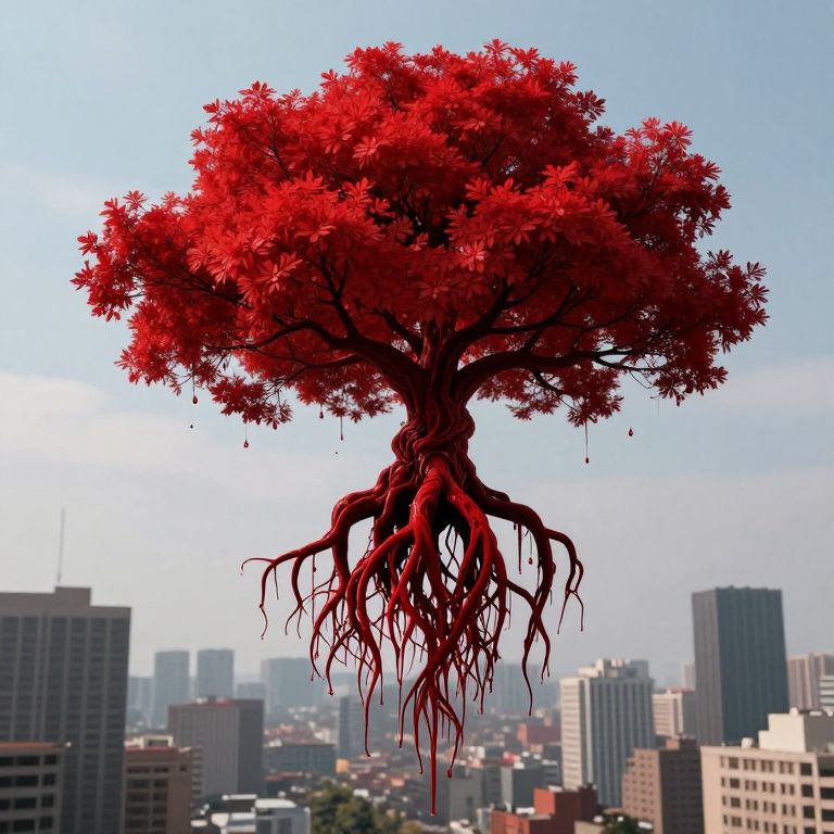 Photograph-like digital artwork of a vibrant red, leafy tree with exposed, intricate roots hanging mid-air above a cityscape. The tree's dense, crimson foliage contrasts sharply with the pale blue sky and the array of modern skyscrapers in the background. The roots dangle downwards, dripping small droplets of a dark red liquid. The city below features tall buildings with varied architectural designs, including glass facades and concrete structures, creating a bustling urban environment juxtaposed with the surreal, floating tree. The image combines realistic textures with a fantastical element, highlighting the tree's otherworldly presence.