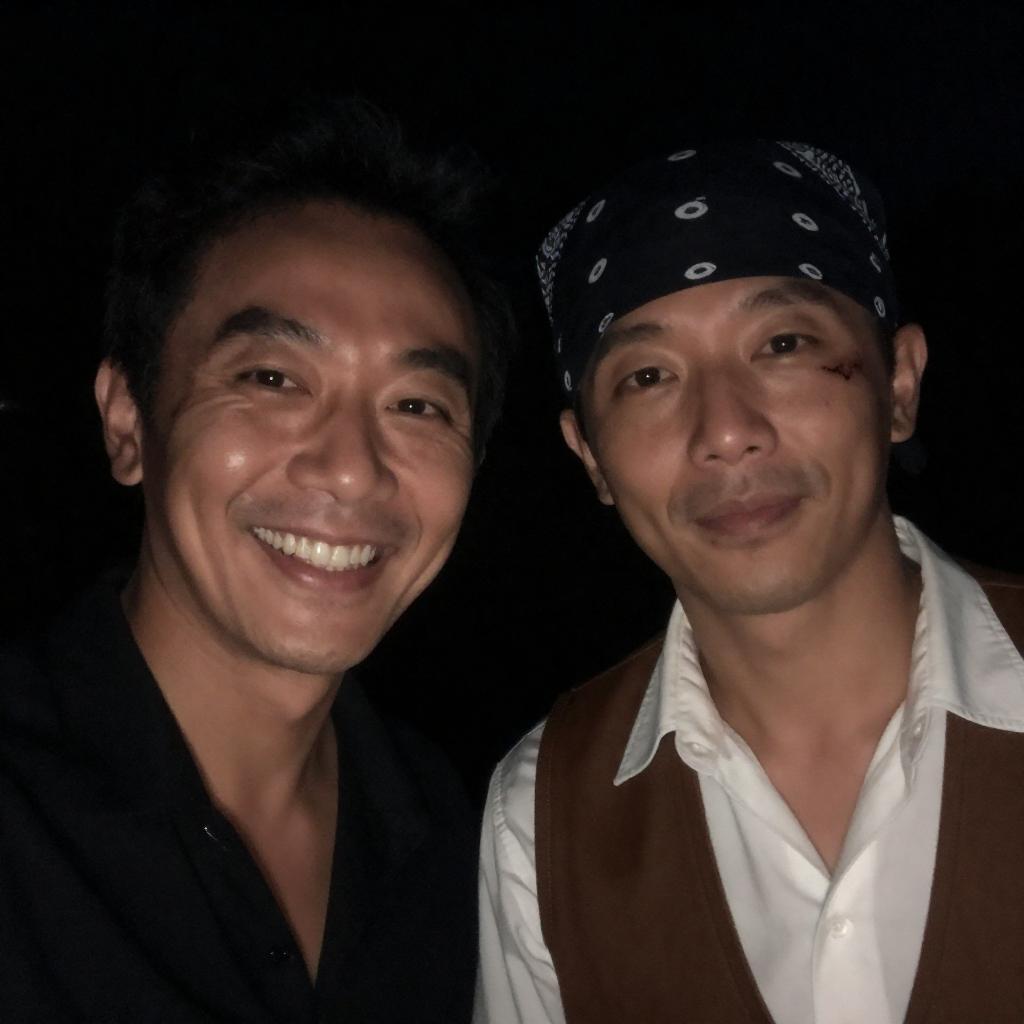 Photograph of two men with dark, shadowed faces, close-up, low lighting. The man on the left has a wide grin, dark hair, black shirt. The man on the right has a bandana, brown vest, white shirt, slight smile, nose scar. Both men are in the foreground, dark background.