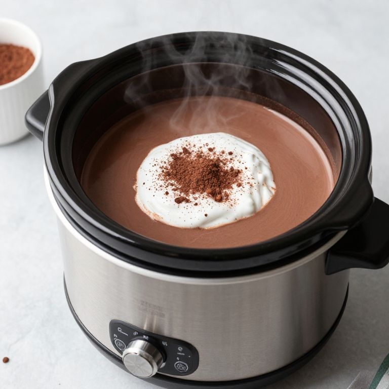 Photograph of a silver electric pot with a black lid, steaming hot chocolate topped with a dollop of whipped cream and cocoa powder, on a