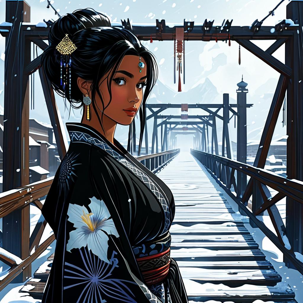 SFW, 1Girl, Adult, (fat Omani:1.2) woman, natural medium breasts, long black spiky hairstyle, wearing black yukata outfit, beryl jewelry, Armored Dress accents, glowing iris, white eyes, pensive expression, empyreal otherworldly blizzard ambience with wooden bridge background, bizarre spiritual desert ambience with shipyard background, flat colors, cel shading, hard shadows, outlines, vector art