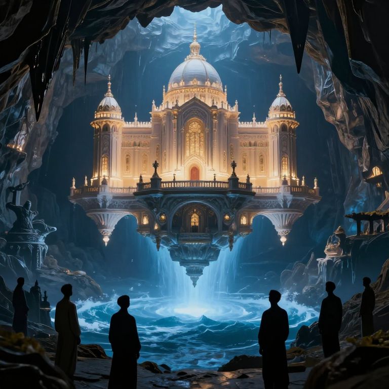 Photorealistic digital art: Silhouetted figures in a cave gaze at a glowing, illuminated domed palace with cascading waterfalls in the