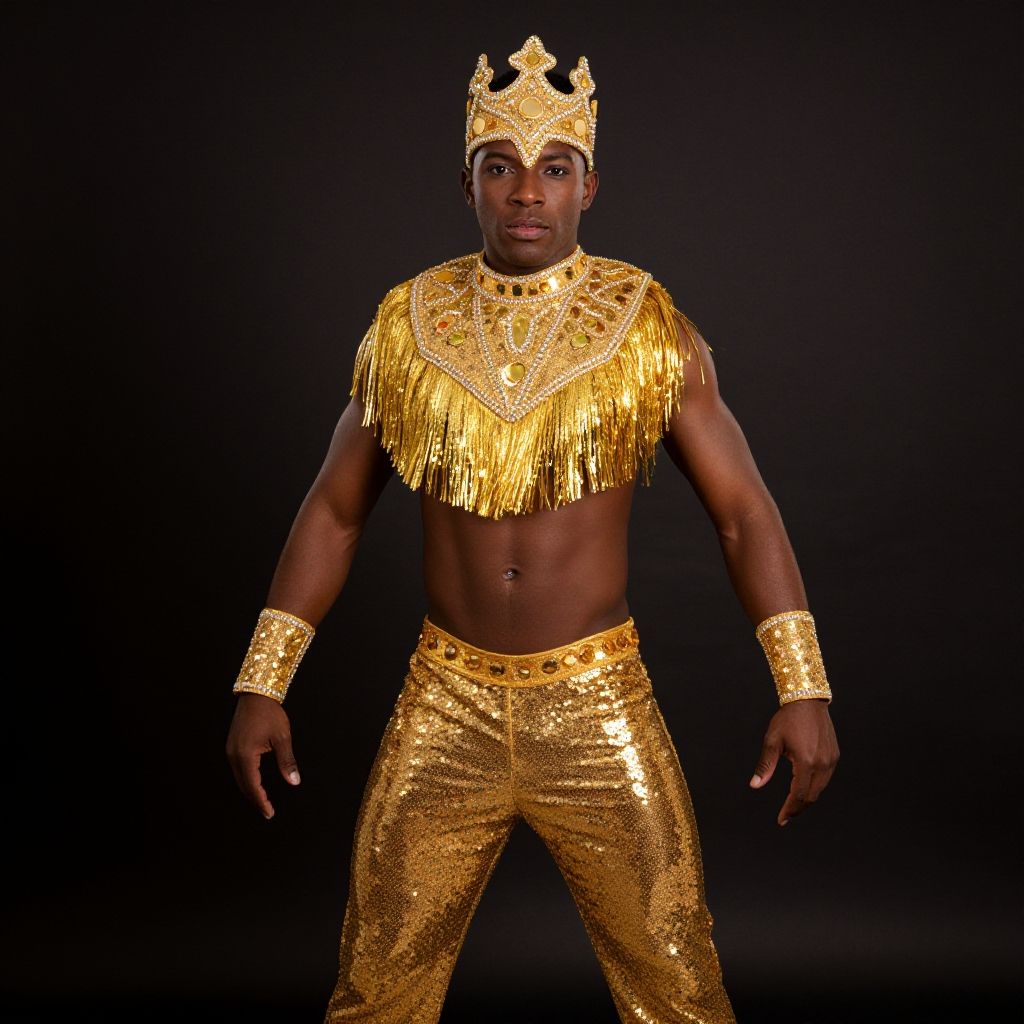 A confident dark-skinned man poses against a dark background wearing a striking gold Samba costume featuring sequined pants, a fringed gold collar, matching wristbands, and a distinctive crown-like headpiece. The outfit is vibrant and elaborate, embodying the festive and rhythmic spirit of Samba dance culture.