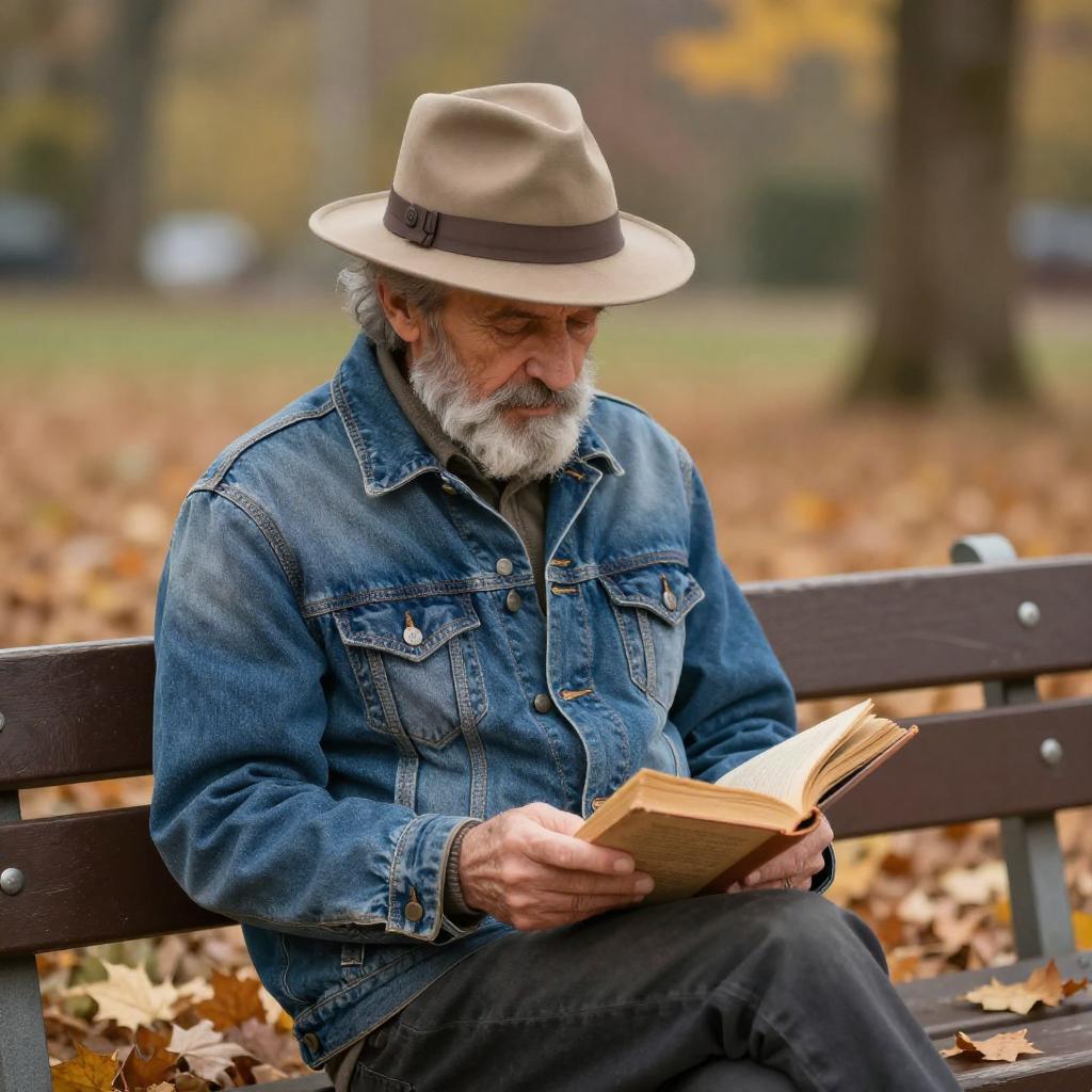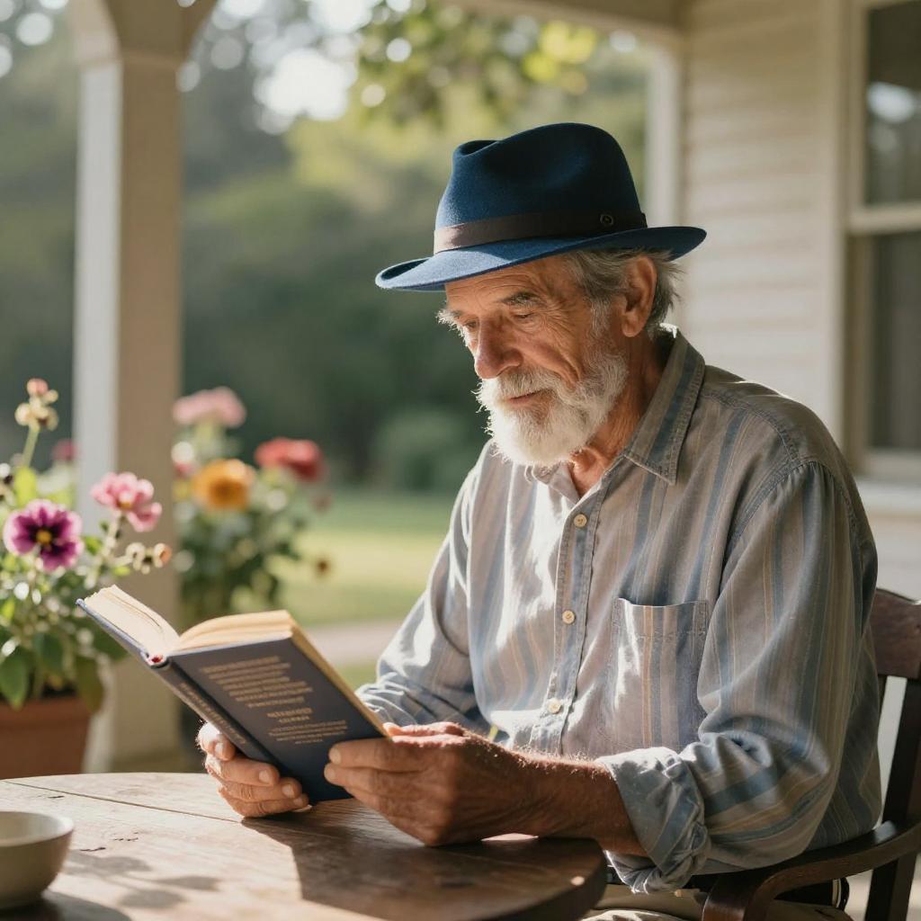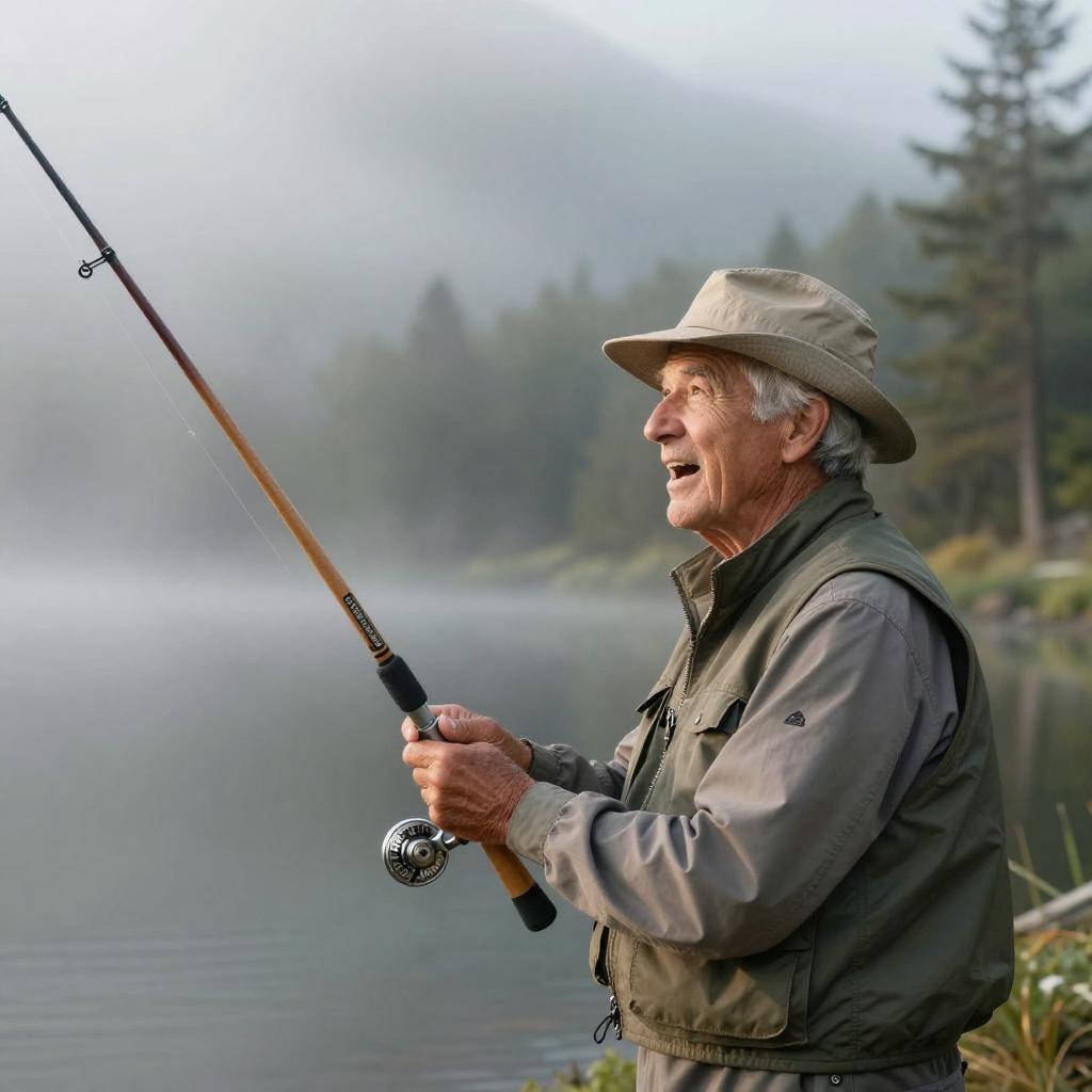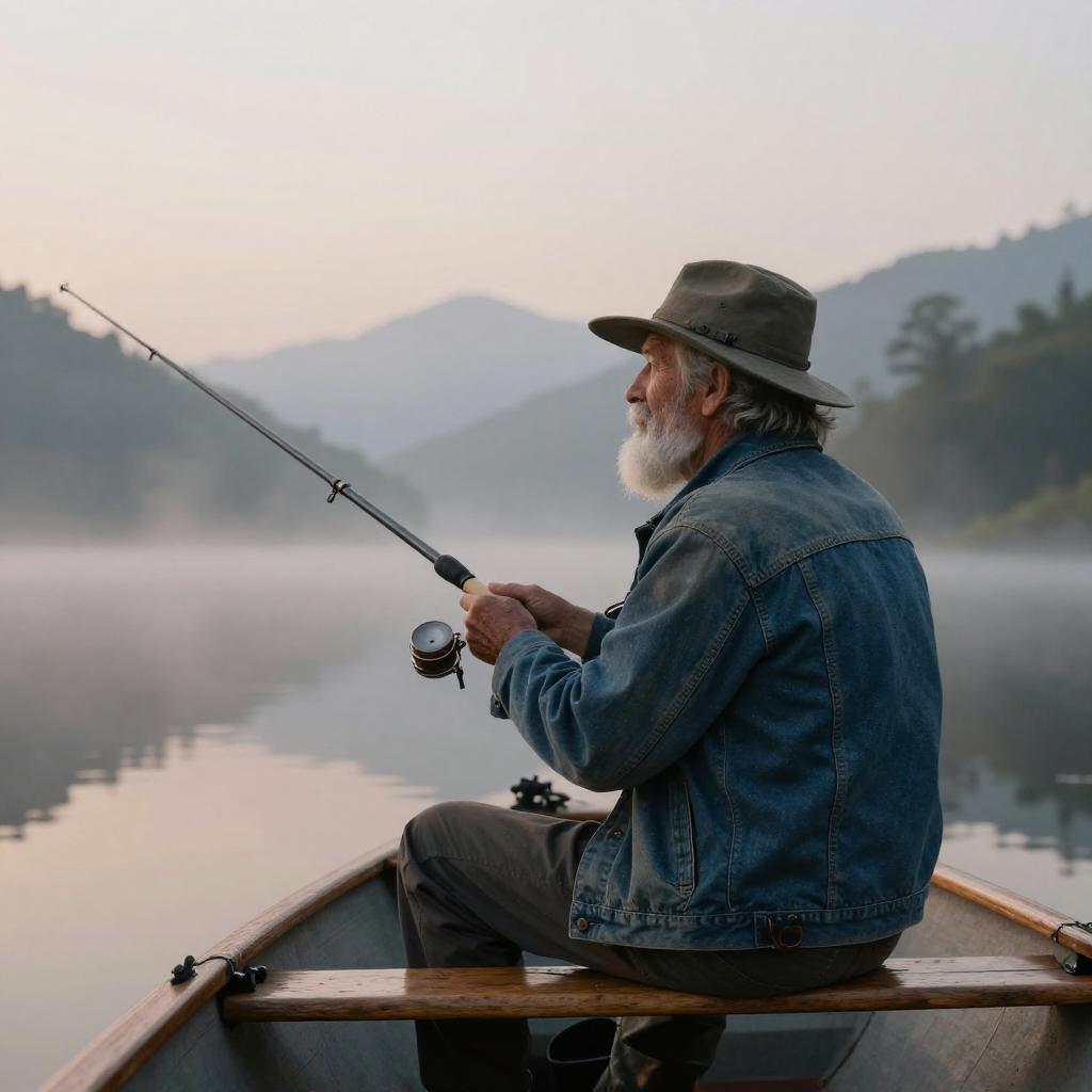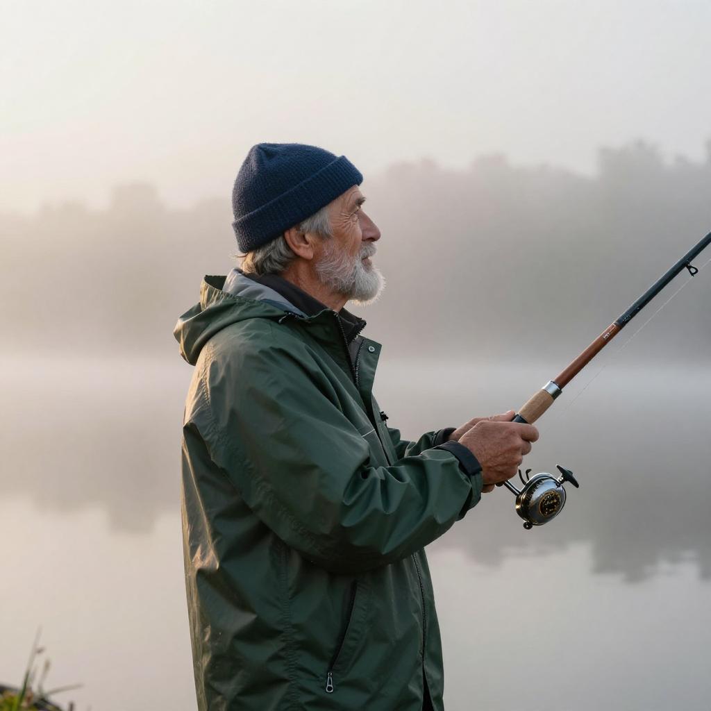 Elderly man with gray beard wearing a blue cap, plaid shirt, and fishing waders sitting on a tackle box while fishing early morning by a foggy lake surrounded by tall reeds. The scene features soft misty light and a natural color palette with a calm, peaceful atmosphere.